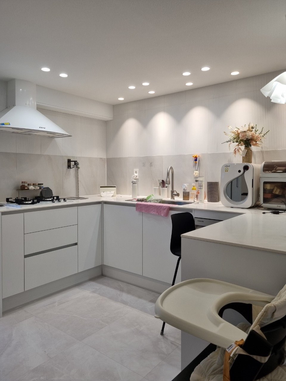 주방은 상부장을 비우고 가벼운 인상을 선택했습니다. 그 자리는 라인 조명과 간접 조명으로 채워 시야가 트이고, 조리대 주변이 한결 넓어 보입니다. 부족할 수 있는 수납은 벽면 키큰장으로 보강해 정리와 디자인을 모두 잡았고, 동선이 단순해져 사용감도 좋아졌어요. 오래된 싱크대는 철거 후 새로 계획해 수납 구획과 깊이도 요즘 생활패턴에 맞게 조정했습니다.