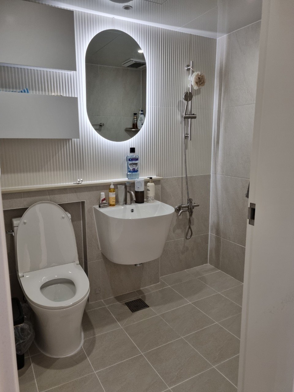 욕실은 화이트와 그레이의 조합으로 모던하고 밝게 마감했습니다. 건식·습식 구역이 자연스럽게 분리되도록 배치해 작은 공간도 답답하지 않게 쓰실 수 있어요. 필요한 수납만 담아 군더더기를 덜고, 유지 관리가 쉬운 자재로 실사용 편의성을 높였습니다.