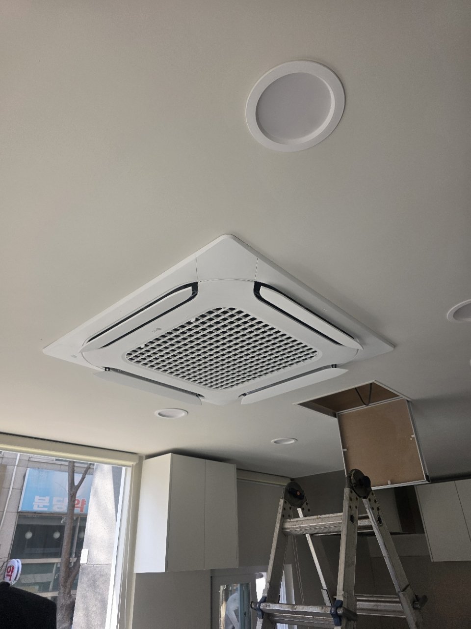 실내기는 마감된 천장 라인과 최대한 자연스럽게 어우러지도록 위치를 조정했습니다. 천장형 냉난방기는 눈에 잘 띄는 위치에 설치되기 때문에, 외관도 중요한 요소입니다. 단순히 작동만 되는 것이 아니라, 인테리어와 조화를 이루도록 설치하는 것이 상업 공간에서는 특히 더 필요합니다.
