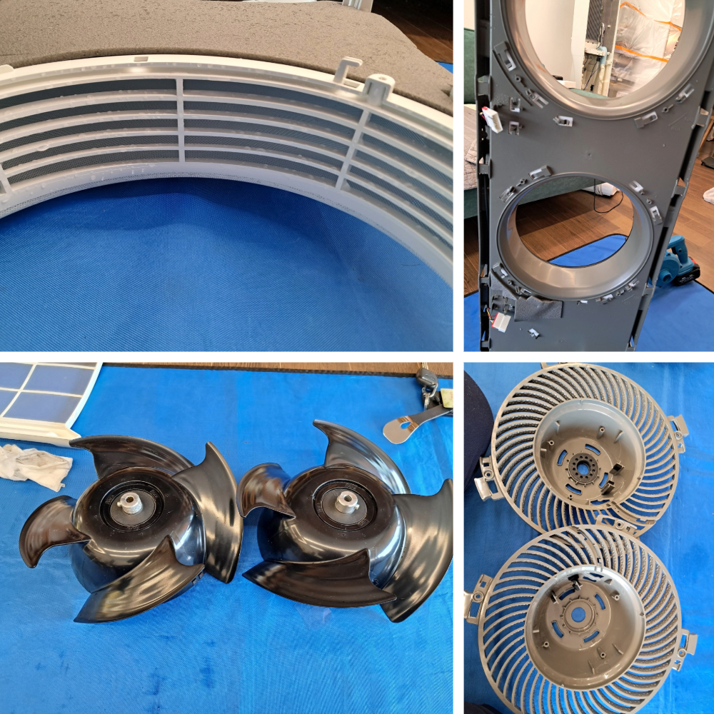 먼저 작업 공간 주변을 꼼꼼하게 보양해 실내 오염을 막아줍니다. 그다음 외장 커버를 분리하고, 팬, 내부 그릴, 냉각핀 주변 부품을 차례대로 분해합니다. 이 과정에서 육안으로는 전혀 보이지 않았던 먼지와 오염을 하나씩 확인할 수 있습니다.
