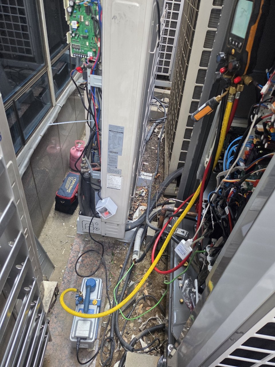 특히 천장을 전부 개방하기 어려운 상황이라, 배관이 어느 실내기로 연결돼 있는지, 전선과 통신선이 어떻게 구성돼 있는지 하나씩 찾아가며 확인해야 했습니다. 기존 실외기 구조도 오래된 방식으로 복잡하게 시공되어 있어, 단순히 철거하고 새로 연결하는 방식으로는 안정적인 결과를 담보하기 어려운 현장이었습니다.
