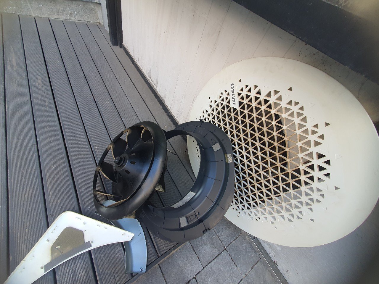 특히 원형 360 에어컨은 구조상 겉 패널과 내부 부품, 드레인 부위를 분리할 때 무게감이 있는 부품을 안정적으로 받아내는 것이 중요합니다. 드레인 쪽은 생각보다 훨씬 무거워, 무리하게 힘으로만 작업을 진행하면 위험할 수 있습니다.