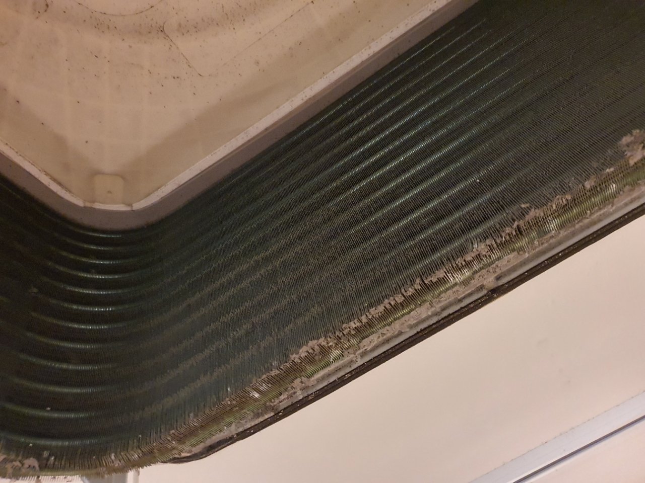 하나씩 전원을 차단한 뒤 패널을 열고 분해해 내부 상태를 확인해 보니, 패널 안쪽과 드레인 주변에 검은색 오염과 먼지가 상당히 쌓여 있었고 에바(열교환기) 부분에도 오염 흔적이 뚜렷하게 보였습니다.