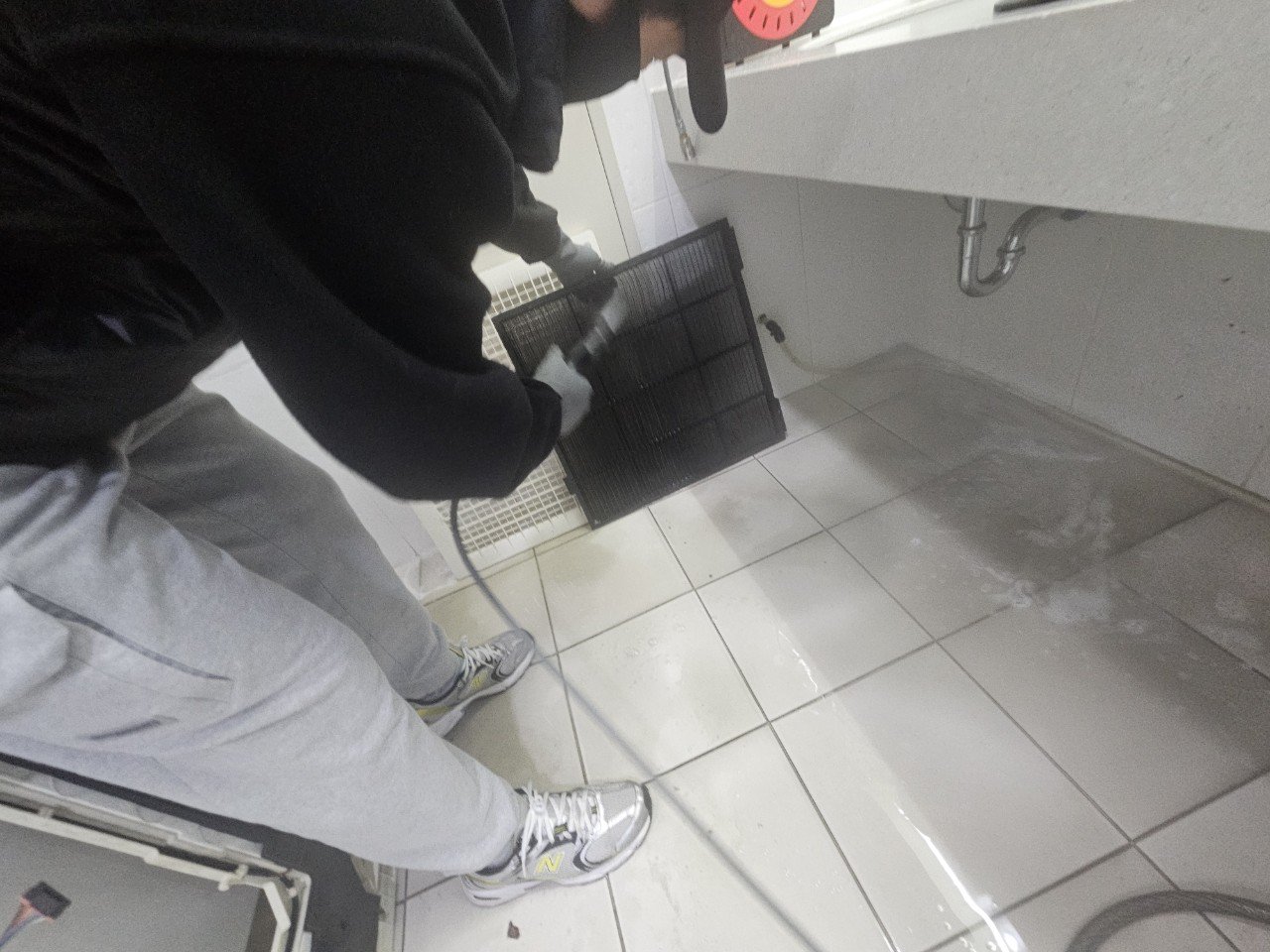 분해 후에는 필터, 그릴, 커버류를 전용 약제로 충분히 불림 처리한 뒤, 고압수로 깨끗하게 세척했습니다. 내부는 열교환기(에바)와 드레인(물받이) 라인을 중심으로 오염을 완전히 불려낸 다음, 여러 방향에서 물세척을 반복해 남은 찌꺼기 없이 헹궈냈습니다.