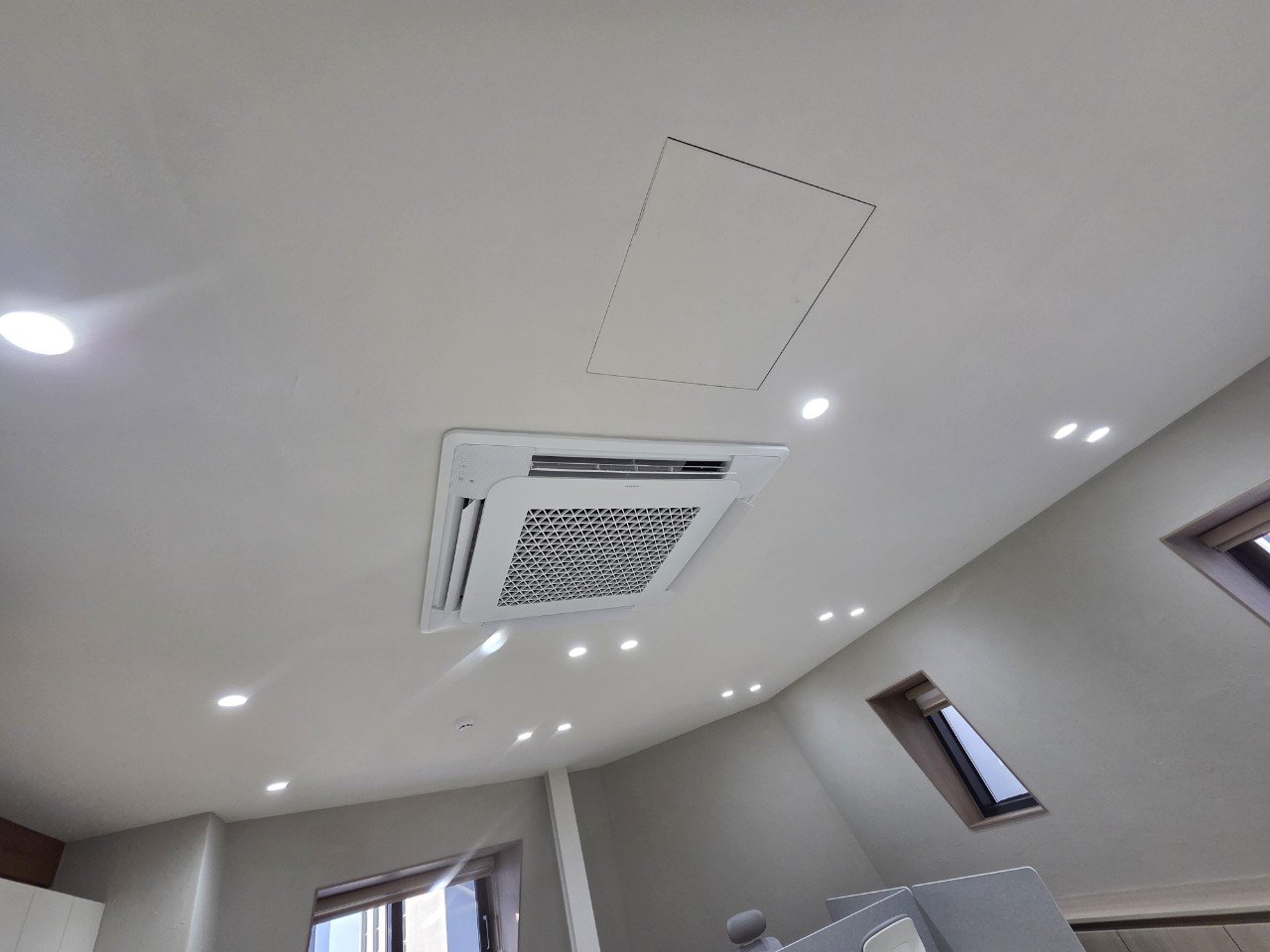 실내기는 인테리어 마감이 어느 정도 진행된 뒤, 천장 마감선과 위치를 맞추어 설치를 진행했습니다. 시스템 에어컨은 천장과의 수평이 정확해야 완성도가 높아 보이고, 마감선이 어긋나 보이지 않습니다.