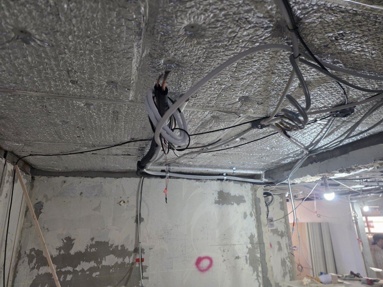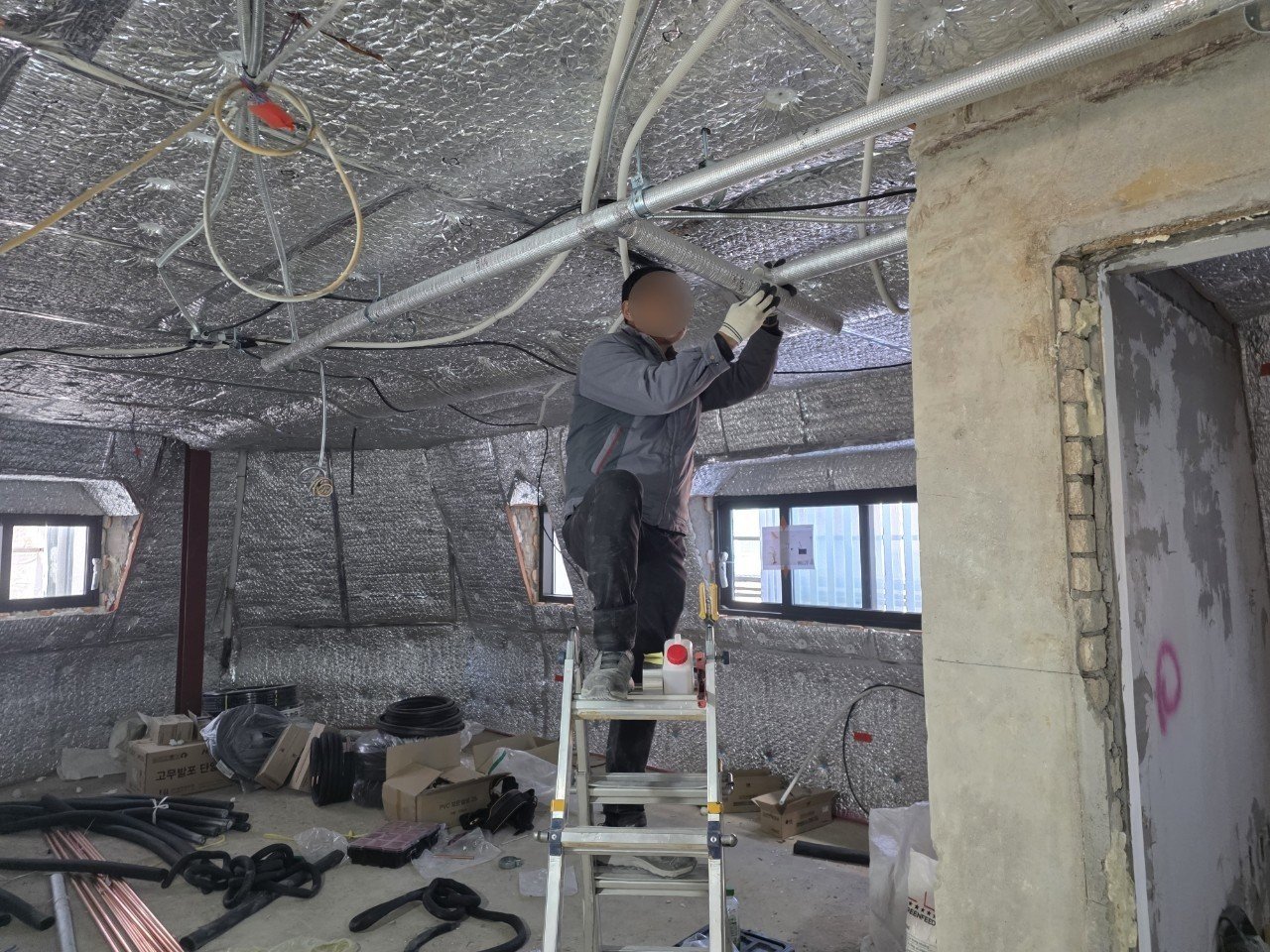 현장에서는 실제 천장과 벽을 보면서 라인을 표시해 가며 작업 동선을 확인했습니다. 이렇게 미리 배관 라인과 실내기 위치를 표시해 두면, 이후 천장 공사나 전기·인테리어 공정과 겹치는 구간에서 불필요한 재작업을 줄일 수 있습니다.