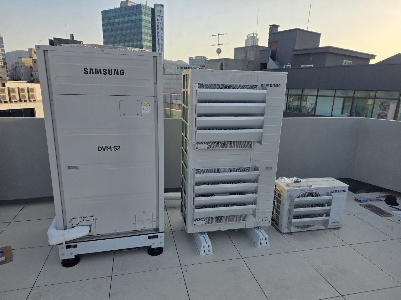 옥상에는 시스템 에어컨 실외기를 설치했습니다. 실외기는 설치 위치와 통풍 조건, 점검 공간 확보가 가장 중요합니다. 장비 주위로 충분한 간격을 확보해 통풍이 원활하도록 하고, 추후 유지보수를 위한 접근성도 함께 고려해 배치를 결정했습니다.