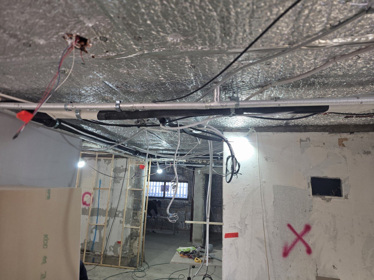계획을 마친 뒤에는 천장 내부와 판넬 구간에 냉매 배관, 배수 라인, 전원·통신 배선을 선행 시공했습니다. 시스템 에어컨 배관은 단순히 연결만 하는 수준이 아니라, 천장 마감 이후 유지보수까지 고려해 고정 간격과 꺾임 반경, 보온 상태를 꼼꼼히 맞추는 것이 중요합니다.