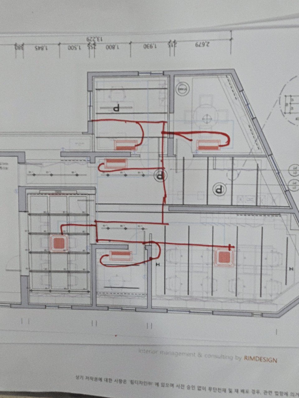 작업을 시작하기 전, 도면과 배관 계획을 먼저 검토하면서 층별 공간 용도와 실내기 위치, 배관 동선을 정리했습니다. 사무공간, 회의실, 복도 등 각 구역의 사용 형태에 따라 냉난방 효율이 좋은 자리로 실내기 위치를 잡는 것이 중요합니다.