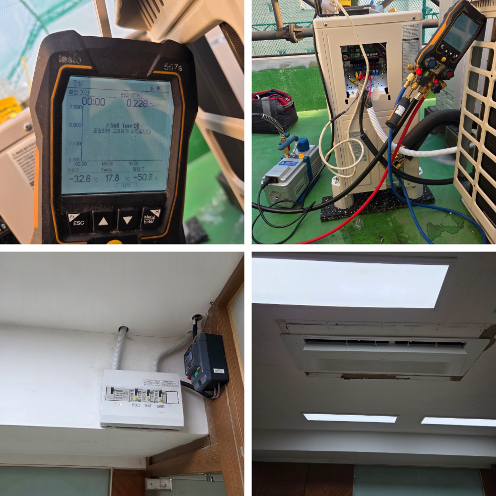 실외기 구간은 배관 하강로와 선로 동선이 겹치는 곳이 있어 더욱 꼼꼼히 체크했습니다. 배수 경사 확보, 진동·소음 최소화 고정, 동파 방지 마감까지 하나씩 확인했고, 진공은 규정 수치가 안정적으로 유지될 때까지 충분히 잡았습니다. 마지막 시운전에서는 냉·난방 전환, 풍량, 소음, 배수 상태를 순차적으로 점검해 정상 작동을 확인했습니다.