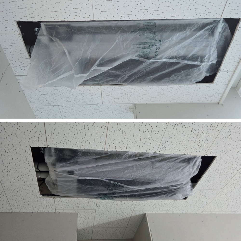그래서 이번에는 실내기 본체까지 설치 후, 천장 석고 및 마감 공사가 끝날 때까지는 판넬을 장착하지 않고 보양 상태로 마감해 두었습니다. 추후 석고 작업과 천장 마감이 마무리되면 다시 방문해 다음을 진행할 예정입니다.