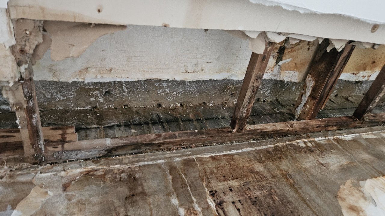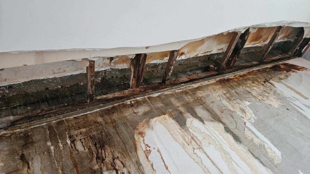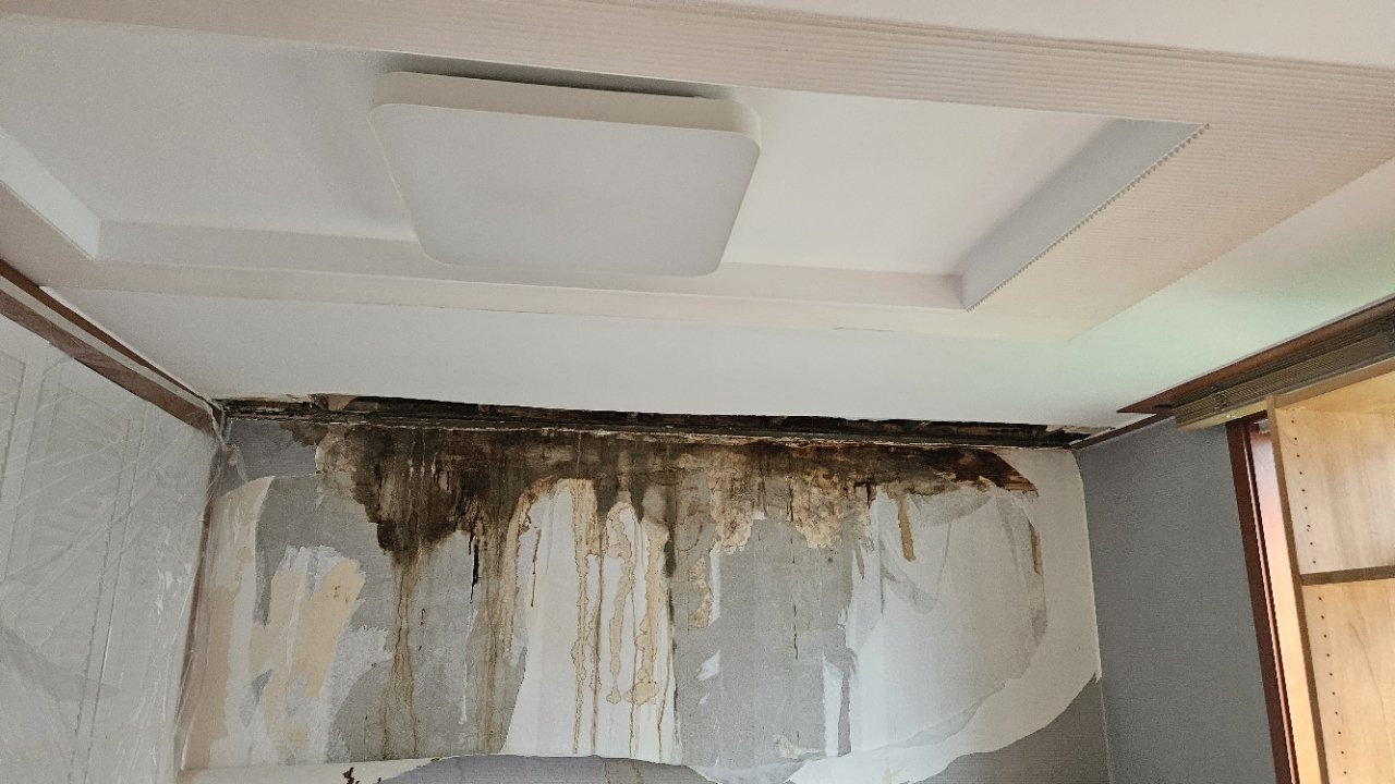 현장에 방문해 작은방 천장 마감재를 열어보니, 상부 구조목과 내부 면을 따라 빗물이 지나간 흔적이 선명하게 남아 있었습니다.