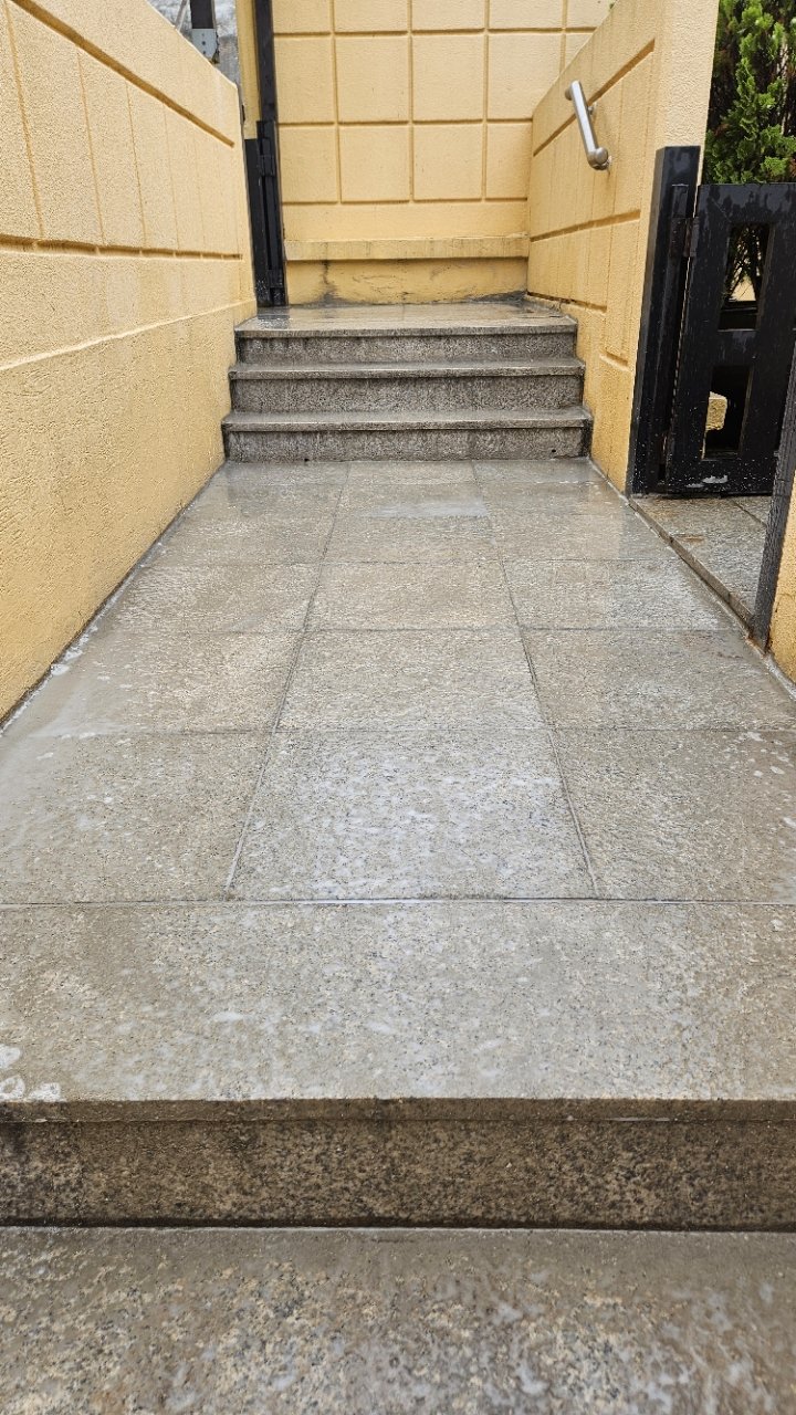 이처럼 상부가 대리석으로 마감된 계단이나 복도 구간은 표면만 보면 멀쩡해 보이는 경우가 많습니다. 하지만 실제로는 줄눈 사이, 조인트 부분, 벽과 바닥이 맞닿는 경계부를 통해 빗물이 서서히 침투하는 경우가 자주 있습니다.