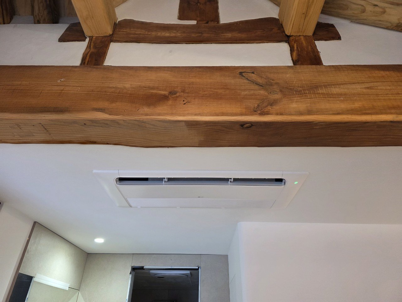 이번 현장은 인테리어 마감 전에 냉매 배관을 먼저 깔아두는 선배관 방식으로 계획하고, 마감 이후 실내기·실외기를 분리 설치하는 2단계 시공을 택했습니다. 한옥은 천장 내부가 노출된 경우가 많아 배관과 드레인 라인을 숨기기 쉽지 않기 때문이죠.