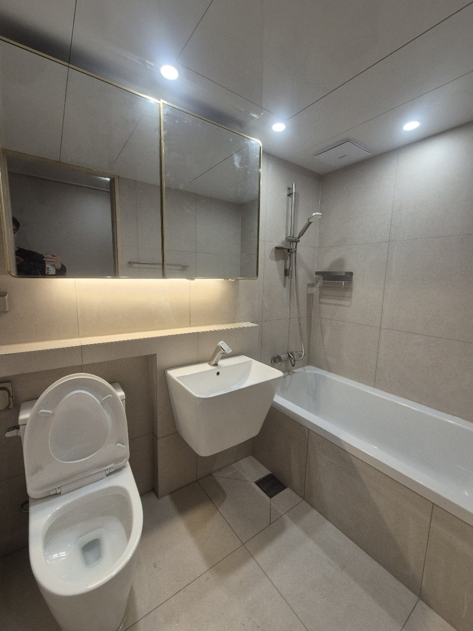 이번 현장에서는 거울장 하부에 조명을 더해 세면 공간을 보다 밝고 산뜻하게 살렸습니다. 기존보다 조도가 높아지면서, 거울을 사용할 때 얼굴이 더 잘 보이고 전체 욕실 분위기도 한층 환해진 느낌을 줍니다.