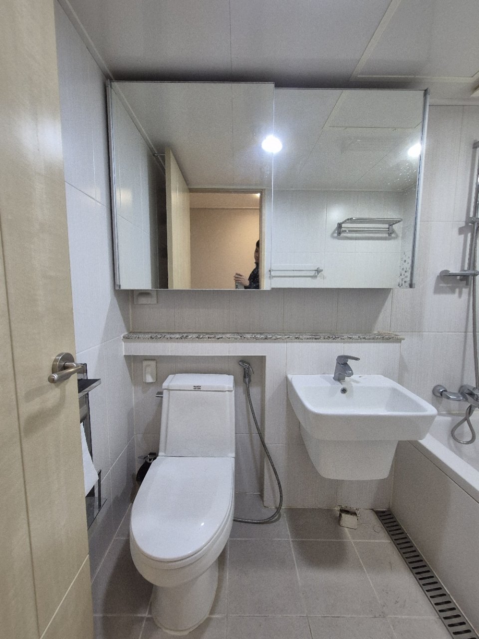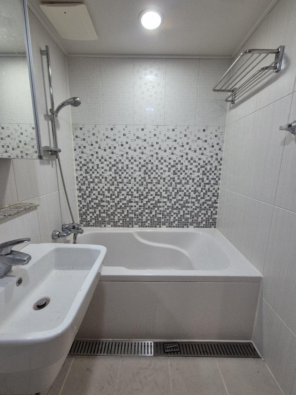 이 아파트 거실화장실은 기존에 욕조가 설치되어 있고, 넓은 거울장과 세면 공간이 한쪽 벽면을 채우고 있는 구조였습니다. 기능적으로 크게 부족한 점은 없었지만, 포인트 타일과 상판 컬러, 전체 톤이 다소 오래된 느낌을 주고 있었고 실제 크기에 비해 더 답답하게 느껴지는 인상이 강한 편이었습니다.