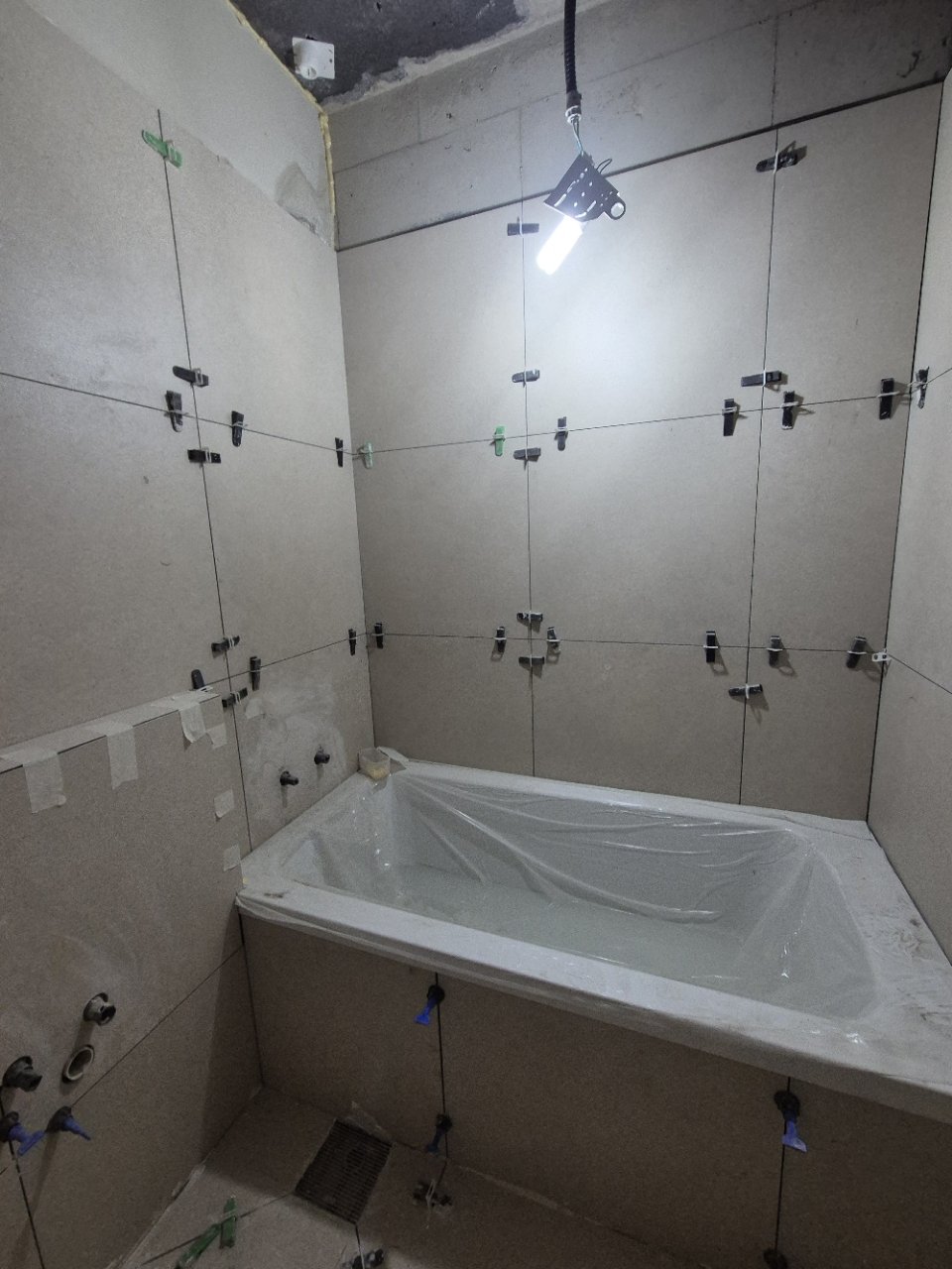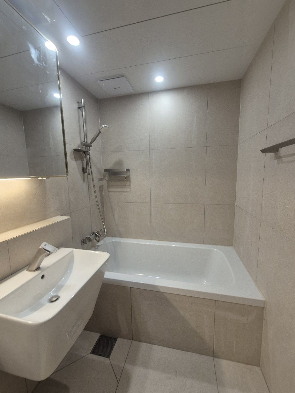 욕조 역시 기존 것을 그대로 두는 방식이 아니라, 구조부터 다시 잡은 뒤 타일 마감으로 정리했습니다. 벽면과 욕조 라인이 자연스럽게 이어지도록 맞추고, 욕조 주변도 포세린타일로 마감해 전체적인 흐름이 끊기지 않도록 신경 썼습니다.