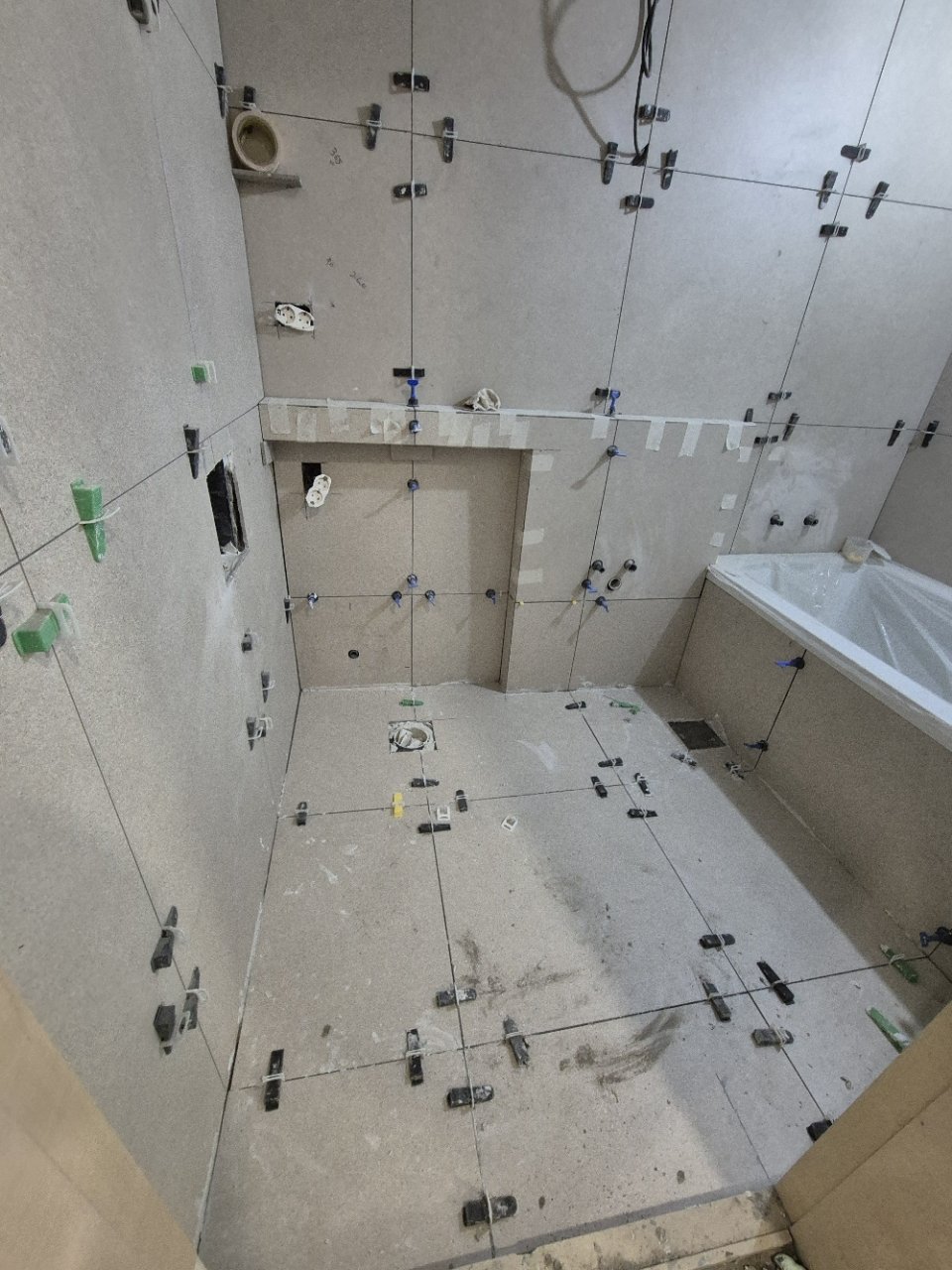 방수 공정이 마무리된 뒤에는 전체 분위기를 정리해 줄 메인 타일을 선정했습니다. 이번 거실화장실은 600각 포세린타일을 사용해 벽과 바닥을 통일감 있게 마감했습니다.
