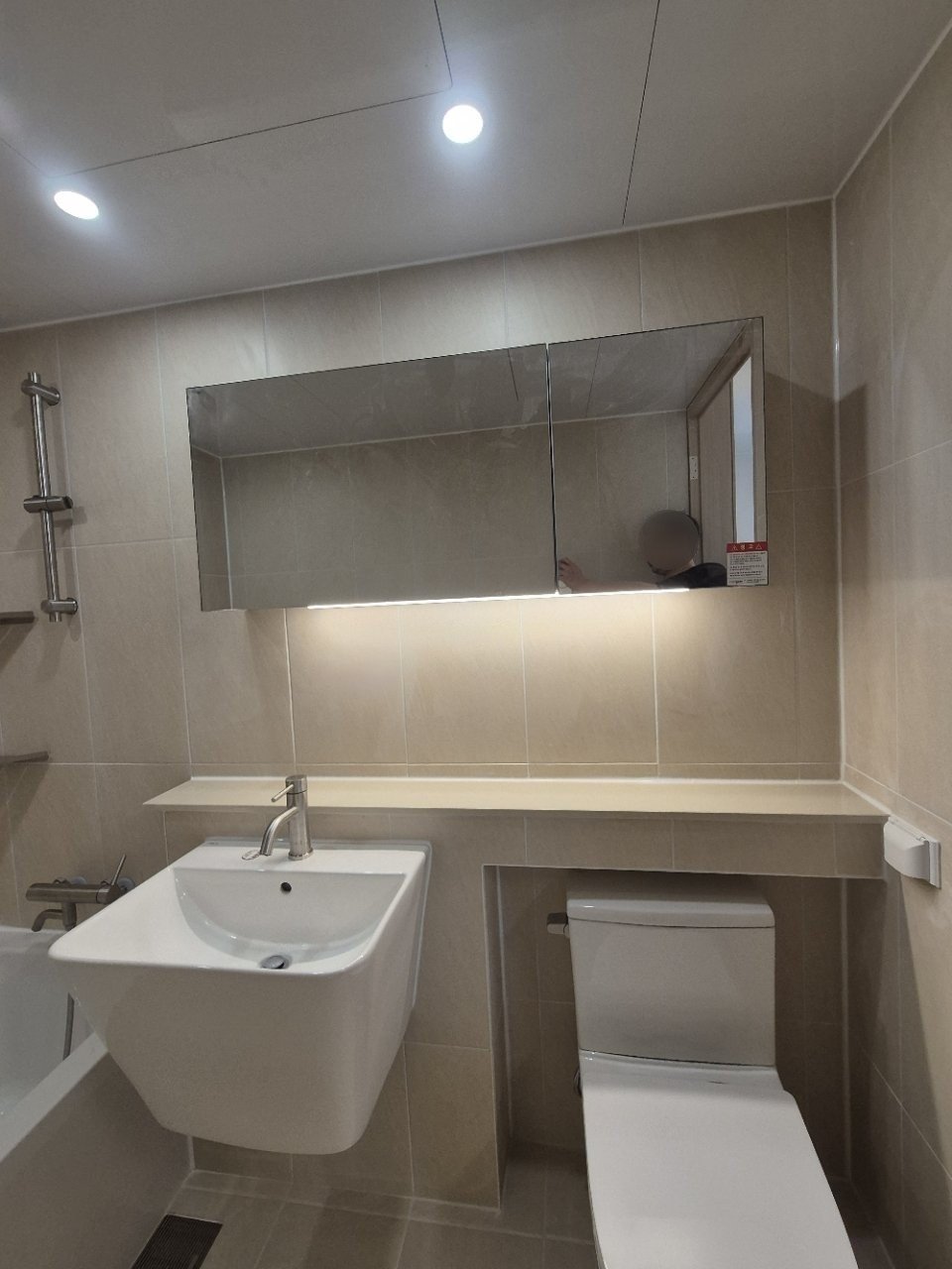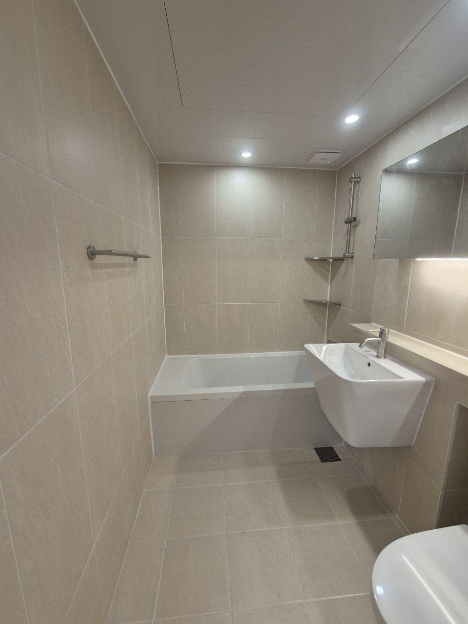 이번 거실 욕실 역시 욕조가 공간 안에서 답답하게 느껴지지 않도록 전체 라인을 차분하게 정리해 드렸습니다. 새 욕조와 함께 세면기, 양변기, 거울장까지 자리를 다시 잡고 나니 이전보다 전체적으로 훨씬 밝고 정돈된 인상이 살아났습니다.
