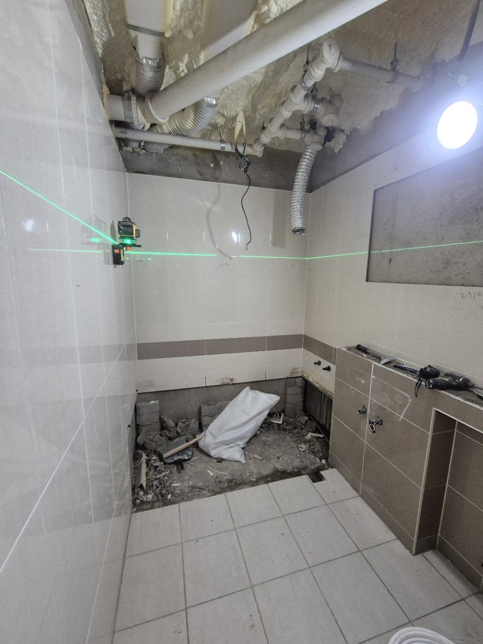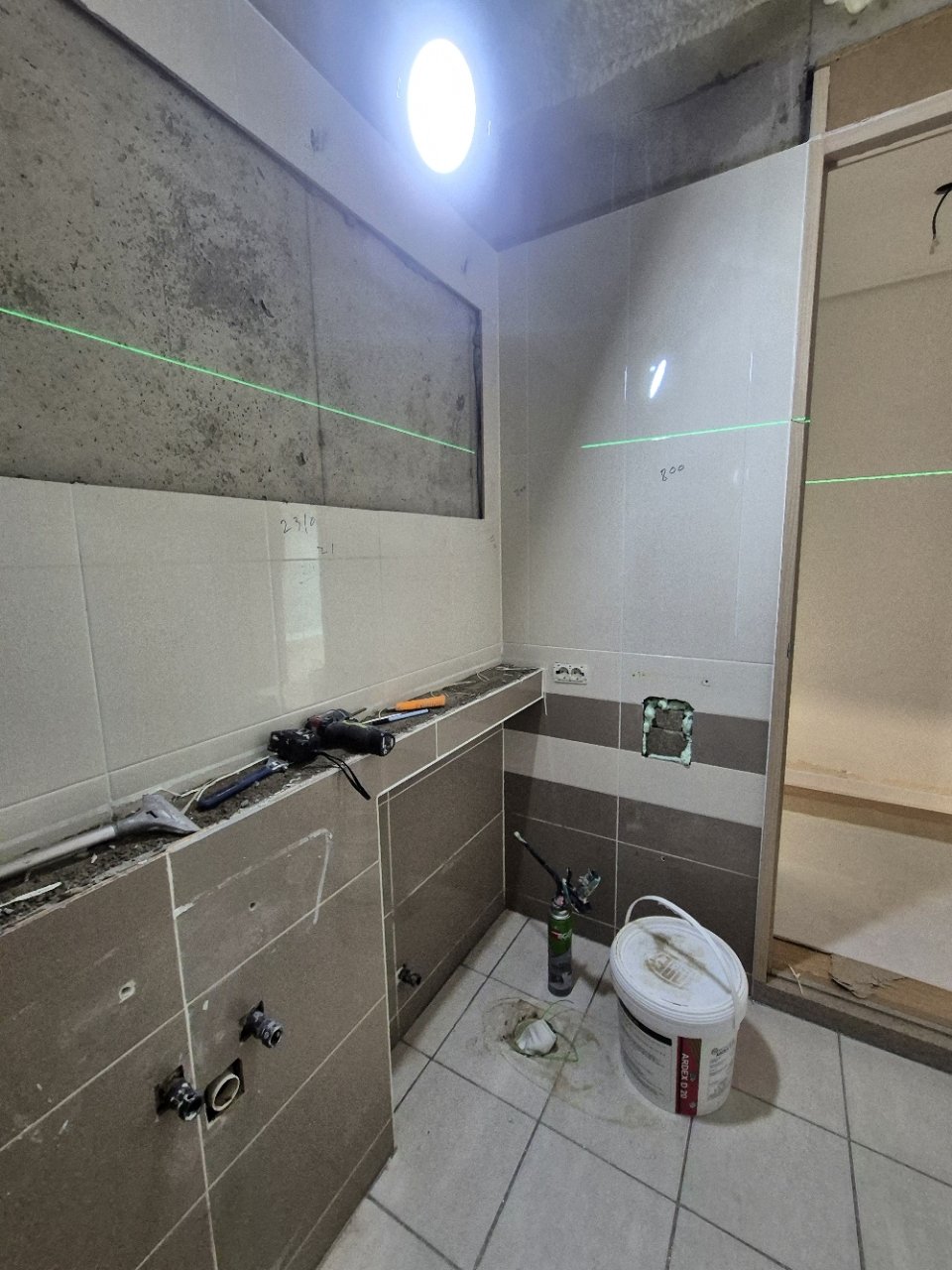 기존 면의 상태와 수평, 마감 두께를 세심하게 확인한 뒤, 어디서부터 어디까지 라인을 맞출지 기준을 정확히 잡는 과정이 무엇보다 중요합니다. 현장에서는 레이저를 이용해 기준선을 꼼꼼히 잡아가며 벽 타일과 바닥 타일의 흐름이 어색하지 않게 하나씩 맞춰 시공을 진행했습니다.