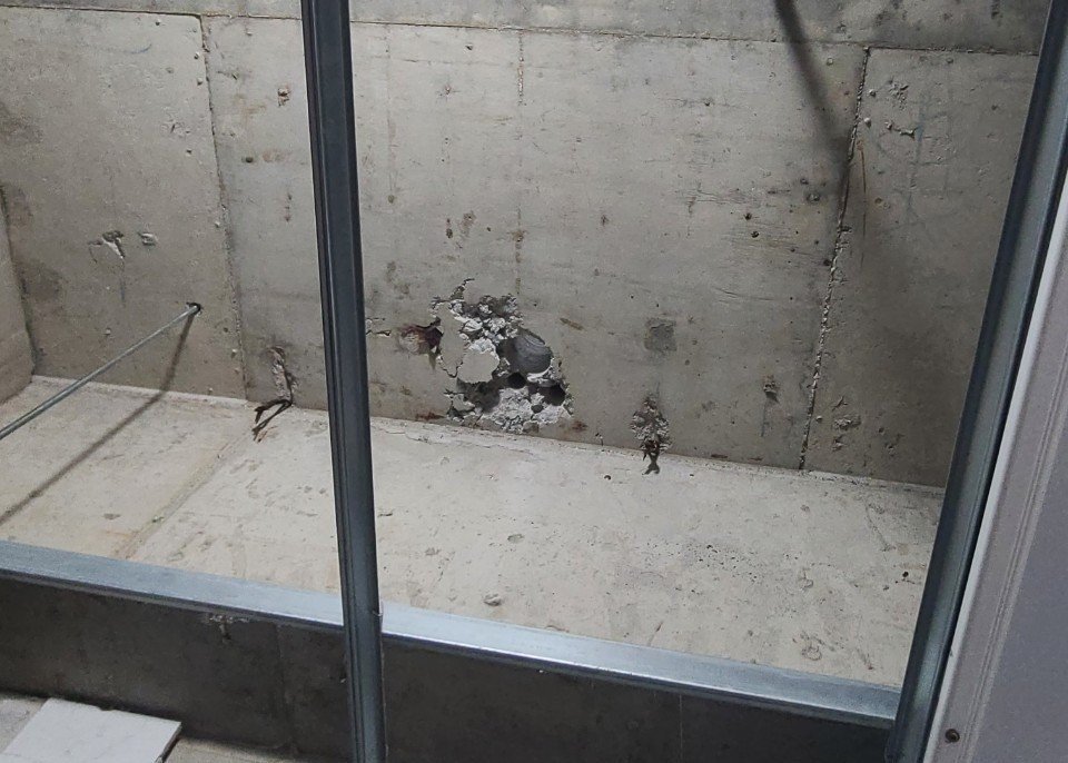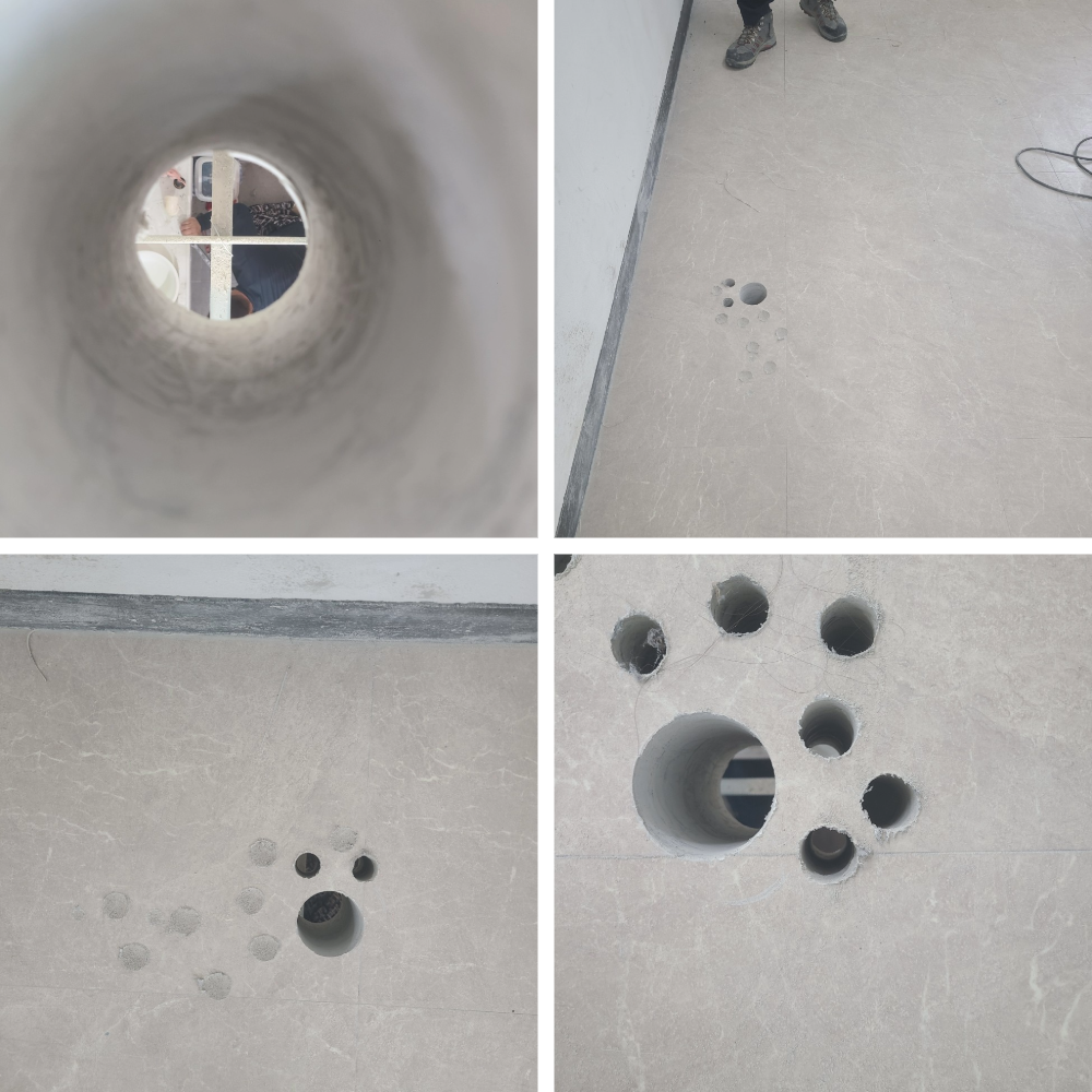 - 건식 코아 천공: 코아비트로 저속·저진동으로 진입해 하향 통로를 정확히 만들었습니다. 건식 집진 장비를 병행해 분진을 즉시 회수했고, 물을 사용하지 않아 현장이 질퍽해지지 않았습니다. 관통 후에는 엣지를 다듬어 배관이 긁히거나 소음이 발생하지 않도록 면치를 냈습니다.
