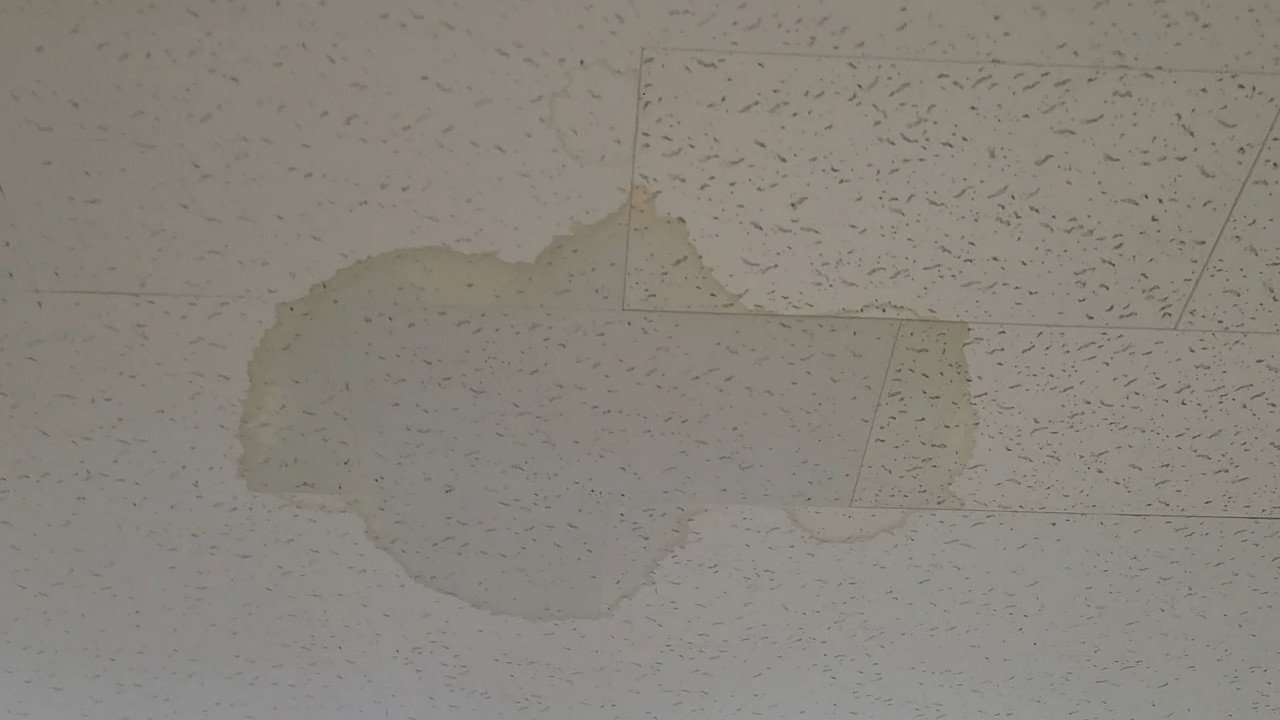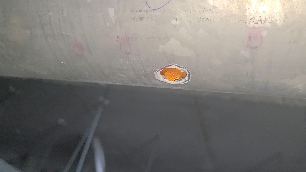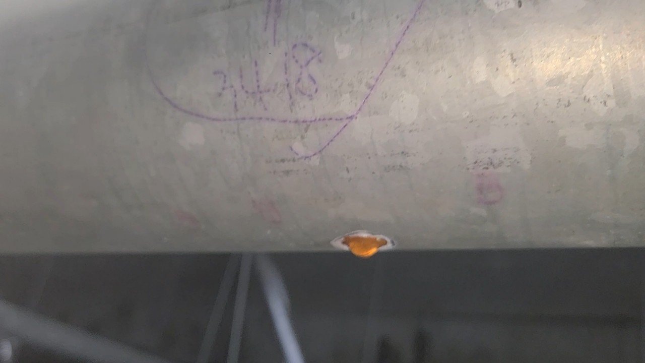 식당 천장 텍스 주변으로 누런 자국과 물길이 길게 남아 있었습니다. 일부 텍스를 개방해 확인해 보니 라인 상부에 녹물 흔적이 퍼져 있었고, 배관 하부 한 점에서 아주 미세하게 분사되는 점부식(핀홀) 누수가 보였습니다.