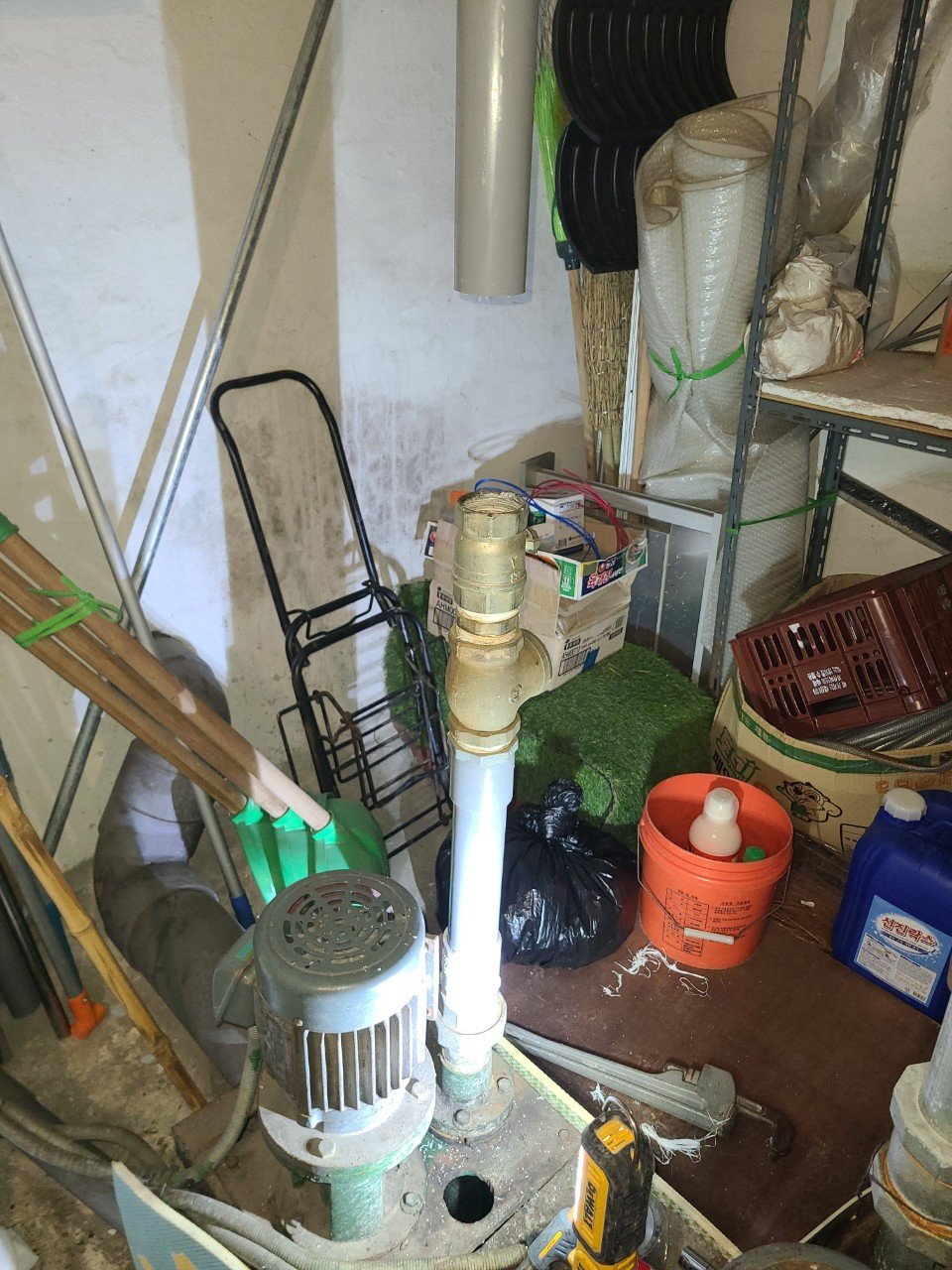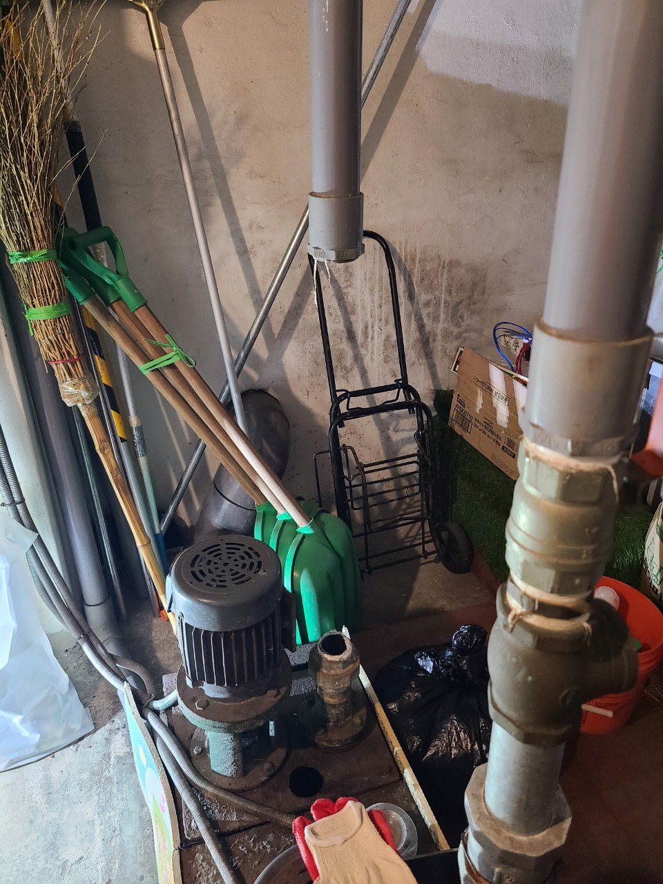 집수정 배수배관을 따라가며 점검을 해보니, 한 구간의 배관 연결부에 테이프가 여러 겹 감겨 있는 부분이 눈에 들어왔습니다. 이미 한 번 문제가 발생해서 급하게 임시로 막아 두었던 흔적이었습니다.