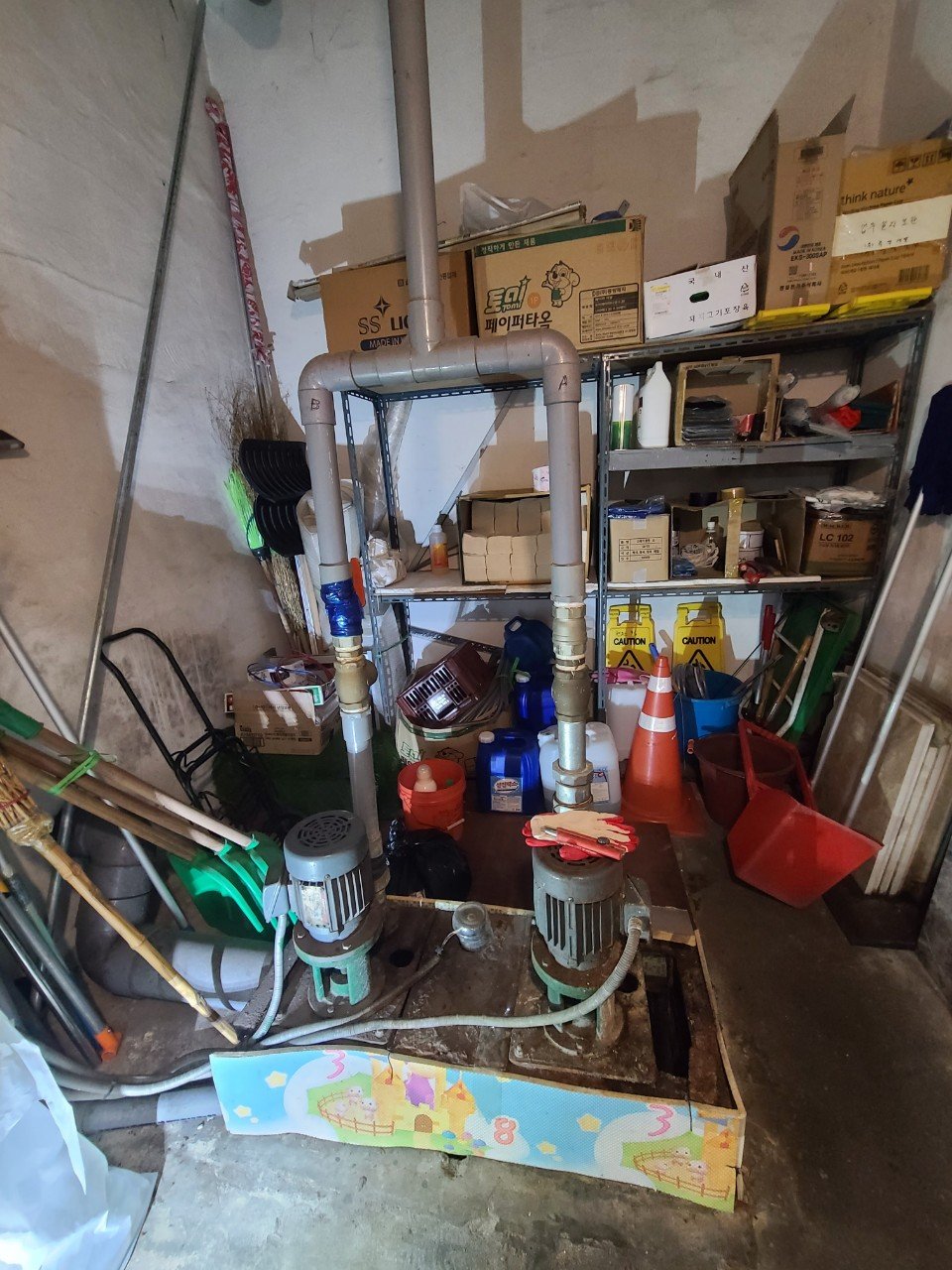 현장에 도착했을 때 가장 먼저 보였던 건 집수정 주변 바닥에 계속 고여 있는 물이었습니다. 겉으로 보기엔 큰 물웅덩이가 아닐 수 있지만, 바닥이 마르지 않고 항상 축축한 상태로 유지되는 건 분명히 배관 어딘가에서 물이 새고 있다는 신호입니다.