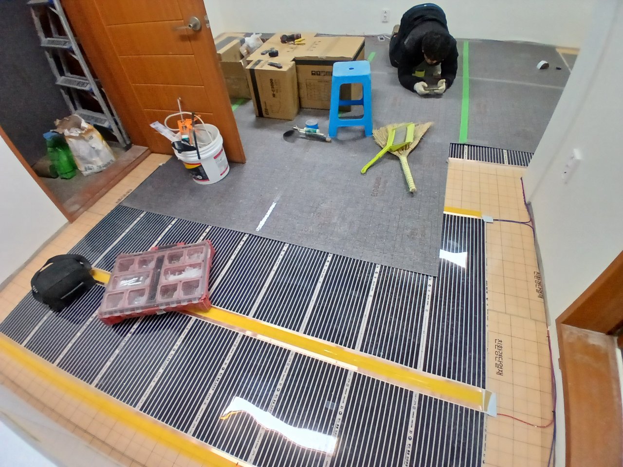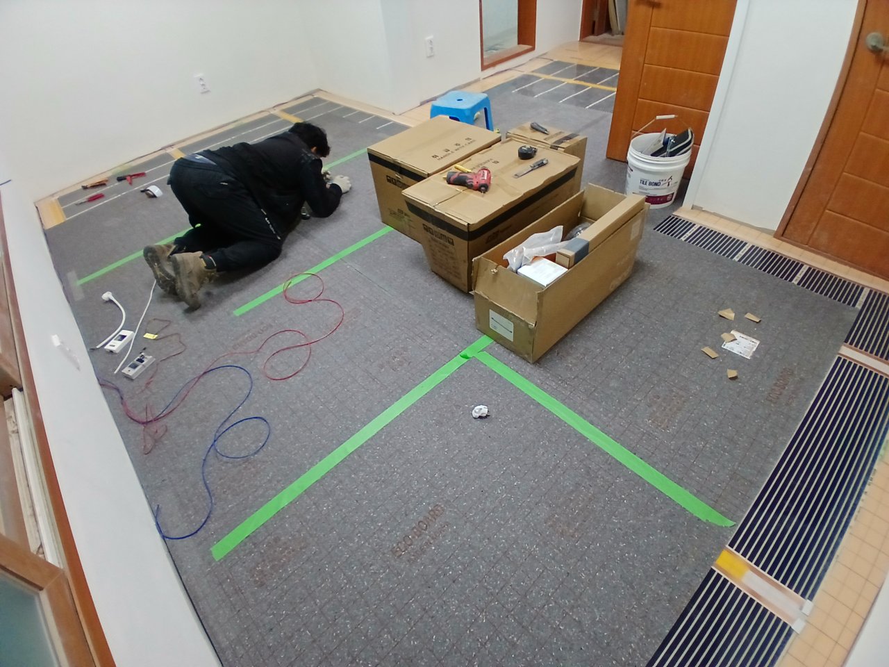거실과 방 전체에는 난방 필름을 깔고, 그 위에 장판을 시공했습니다.