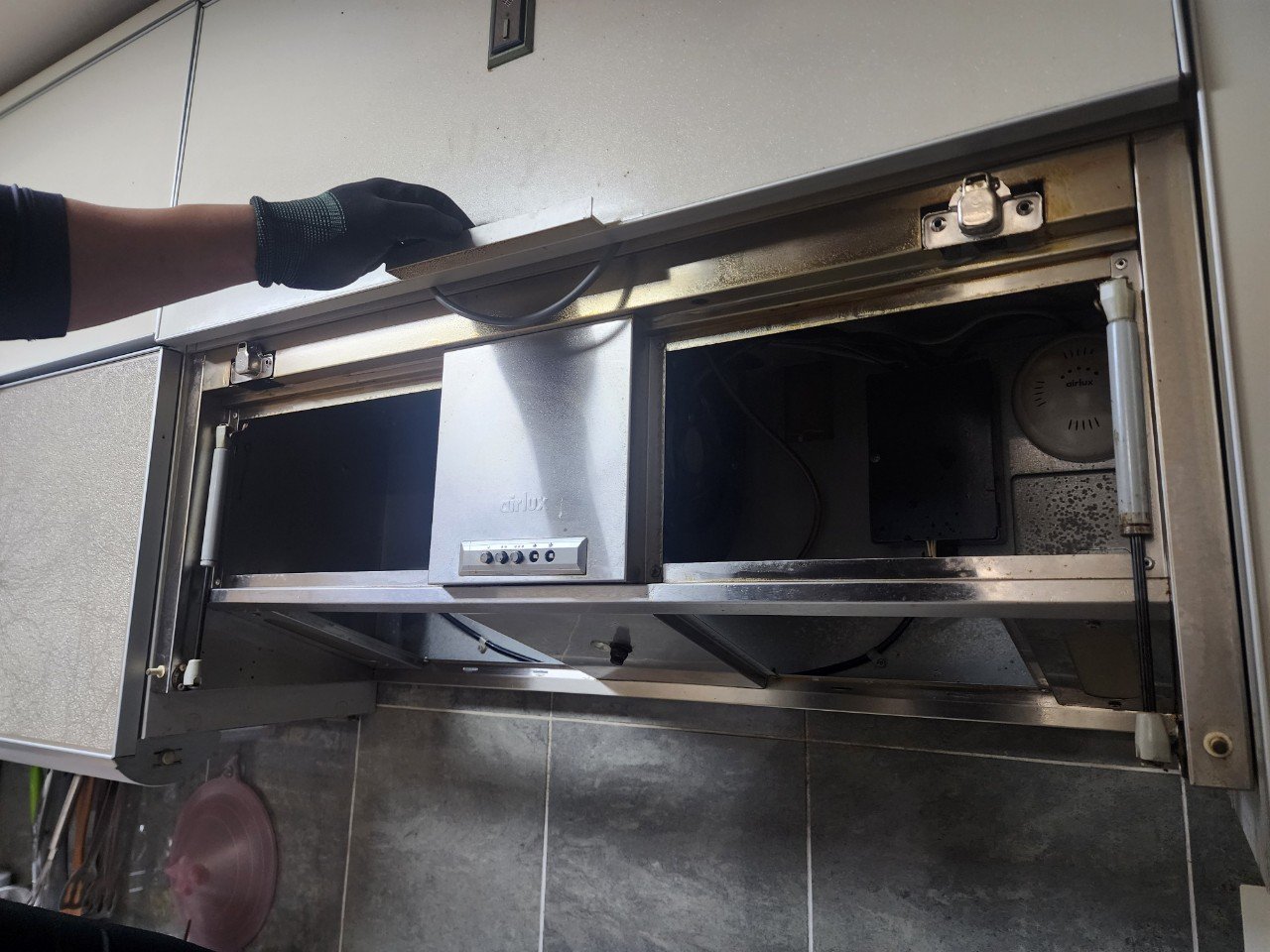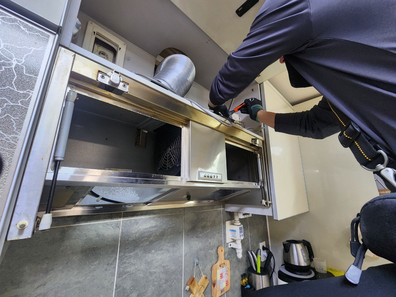 작업은 가스레인지 상부 보양부터 꼼꼼히 시작했습니다. 기존 도어형 본체를 분해·철거한 뒤 내부 상태를 점검했는데, 팬 하우징과 덕트 연결부에 기름때와 먼지가 꽤 쌓여 있더군요. 이물질을 제거하고 하우징을 깨끗하게 세척한 다음, 덕트와 후드 접합부를 재정렬하고 알루미늄 테이프로 기밀을 잡았습니다. 역풍 방지 댐퍼의 작동도 확인해 배기 흐름을 방해하는 요소가 없도록 했고요.