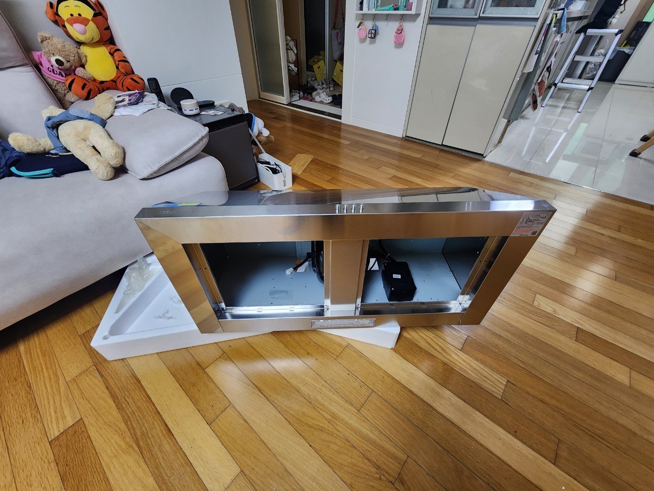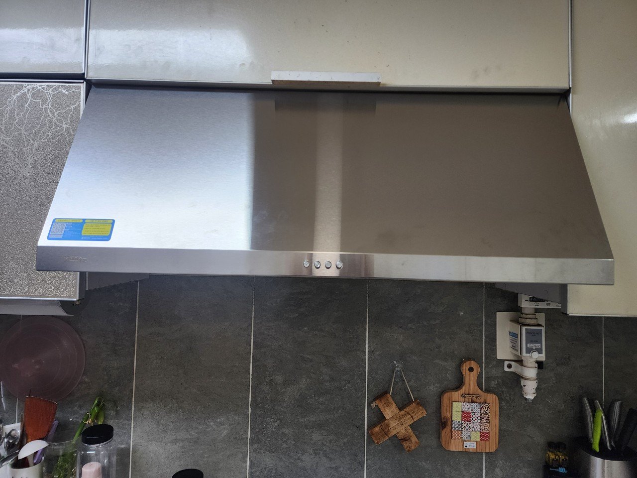 설치 후에는 풍량, 소음, 조명 상태를 단계별로 점검했습니다. 이전에 도어 메커니즘에서 나던 떨림이 사라지고, 중·강풍에서도 일정한 흡입이 유지되었어요. 후드 아래 여유 공간이 넓어져 조리할 때 머리 닿는 답답함도 줄었다고 하셨습니다. 기존에 후드 옆에 있던 소화기는 열원과 간섭이 없도록 위치를 안전하게 재배치해 드렸고요.