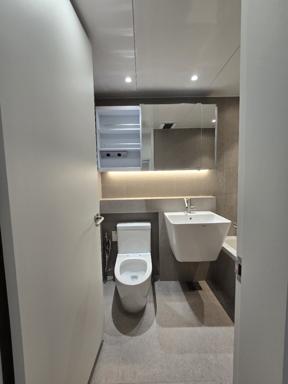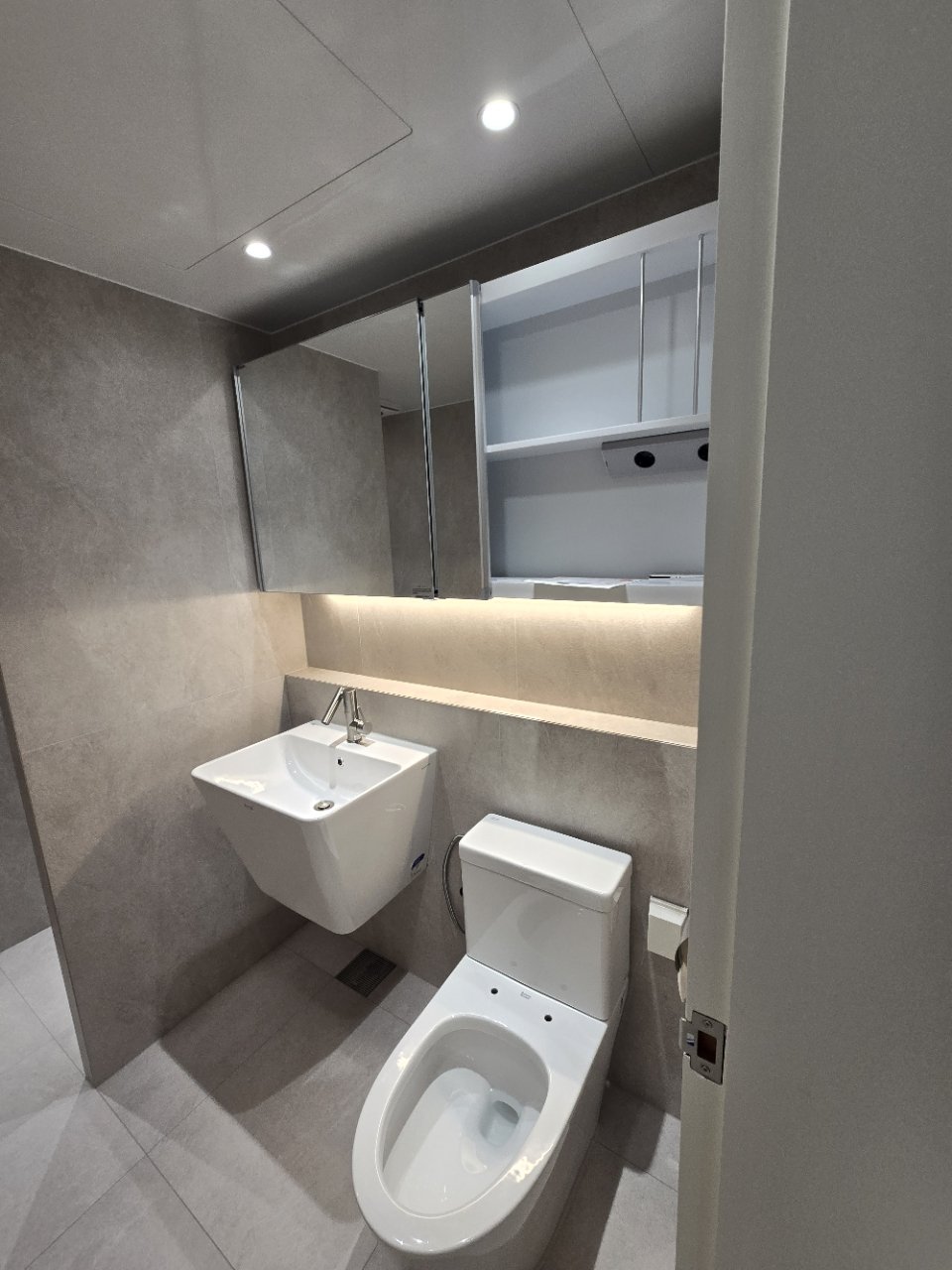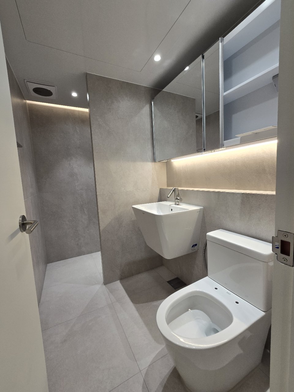 안방에 위치한 욕실은 조금 더 프라이빗한 용도에 맞춰 샤워 공간을 넓게 확보했습니다. 샤워 시 답답함이 느껴지지 않도록 동선을 여유 있게 비워 두었고, 거울 수납장을 활용해 세면도구와 일상 용품을 안쪽에 정리할 수 있게 구성했습니다. 겉에서 보이는 물건을 최소화해 항상 정돈된 욕실 느낌을 유지할 수 있습니다.
