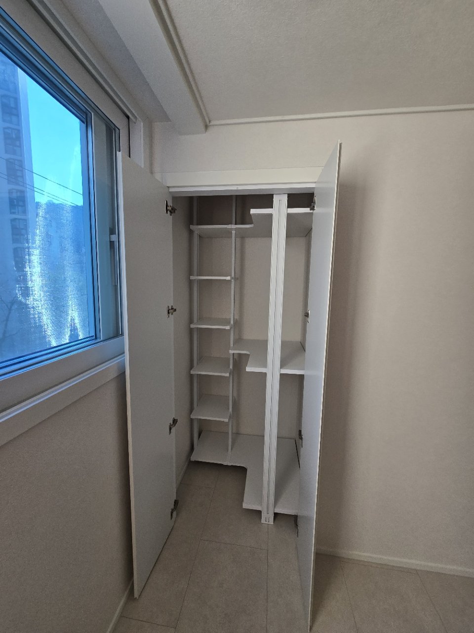 수납은 붙박이장으로 정리해 옷과 생활용품을 한 곳에 모을 수 있도록 구성했습니다. 문을 닫아 두면 수납량과 상관없이 침실이 단정하게 보이기 때문에, 아침에 준비할 때도 물건을 찾기 쉽고 항상 깔끔한 인상이 유지됩니다.