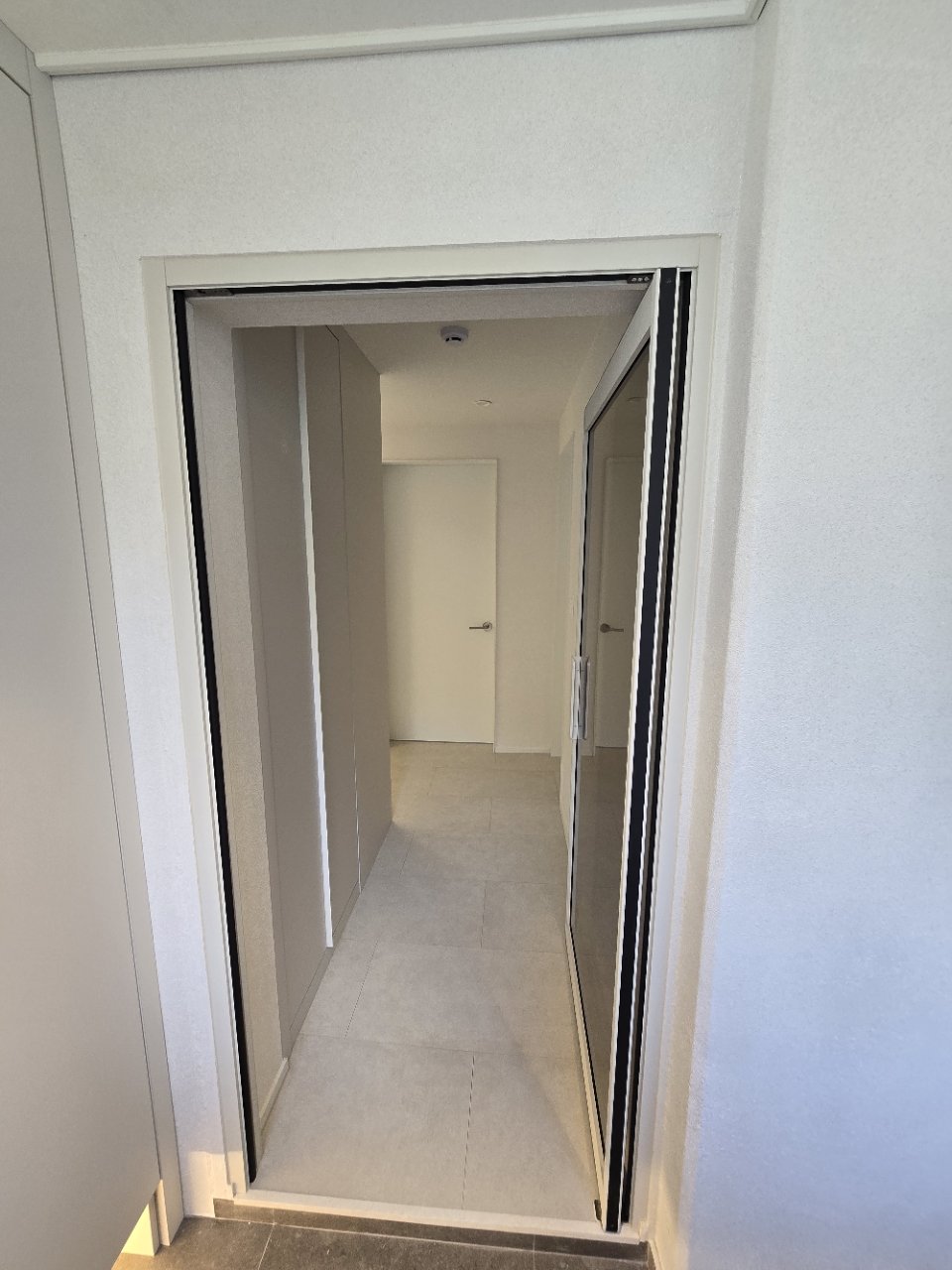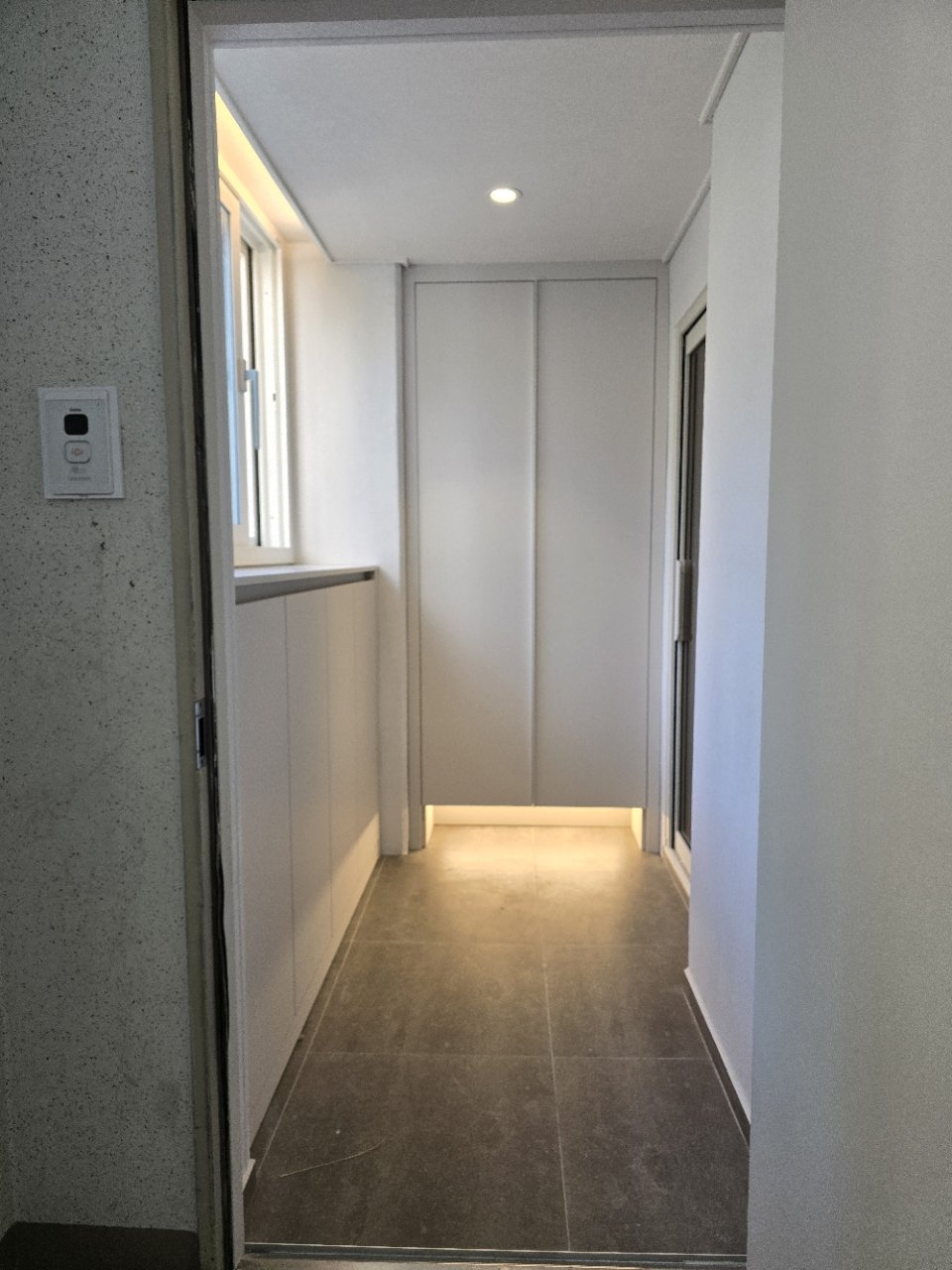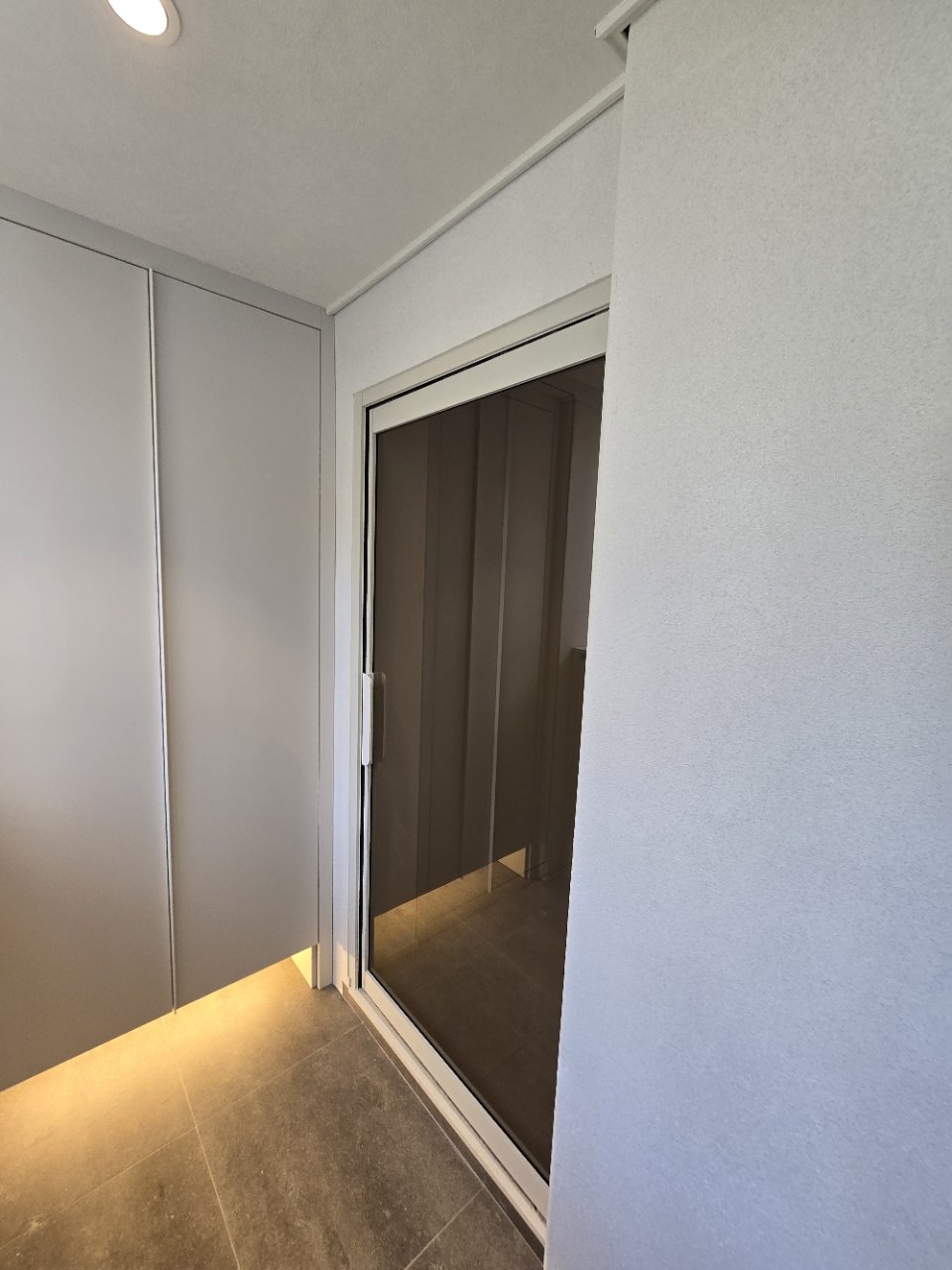 이 집의 현관은 처음부터 “보관”과 “정리”를 최우선으로 두고 설계했습니다. 화이트 톤의 긴 수납장을 벽면을 따라 배치해 신발뿐 아니라 자주 사용하는 생활용품까지 함께 정리할 수 있도록 구성했습니다.