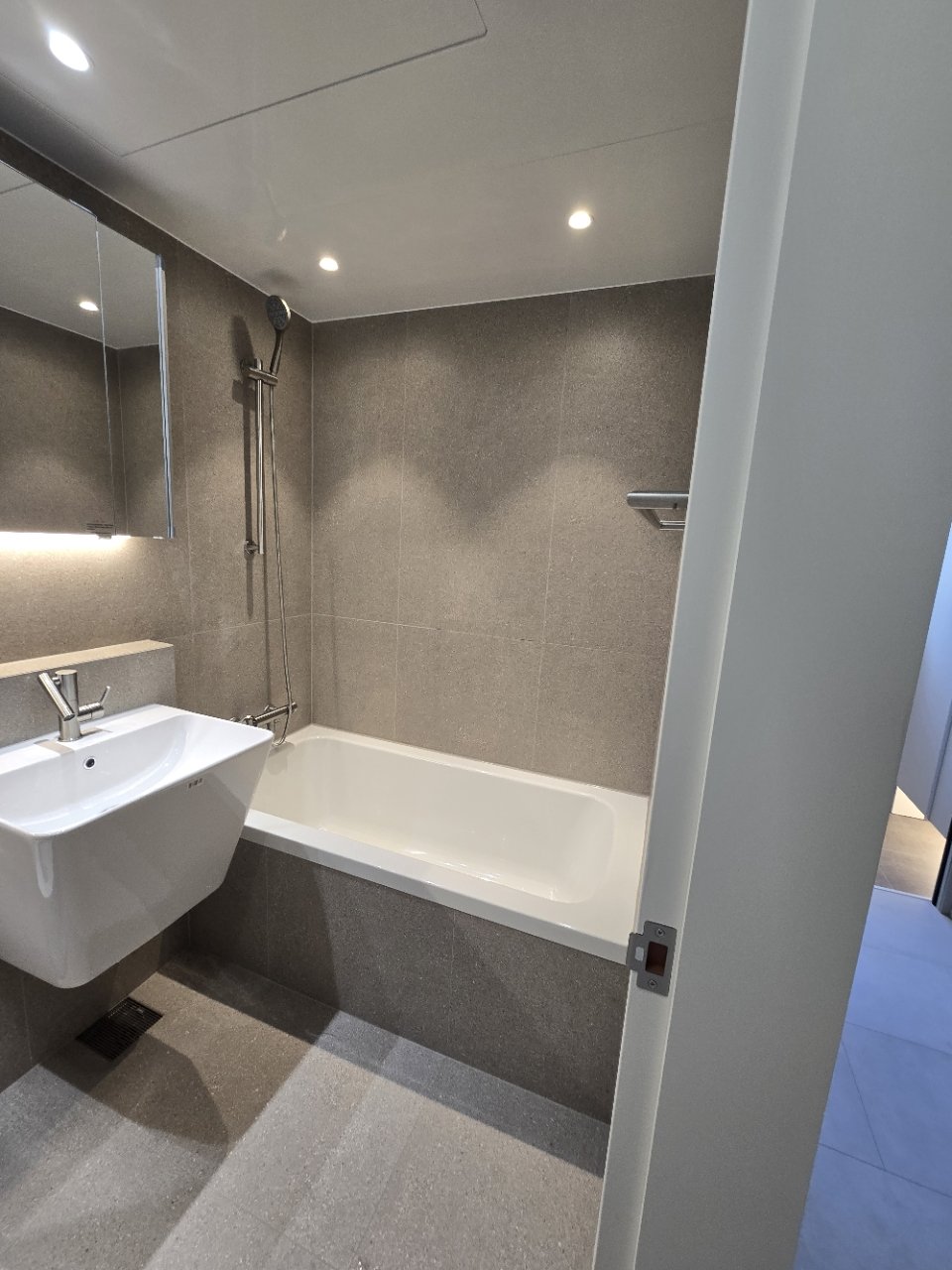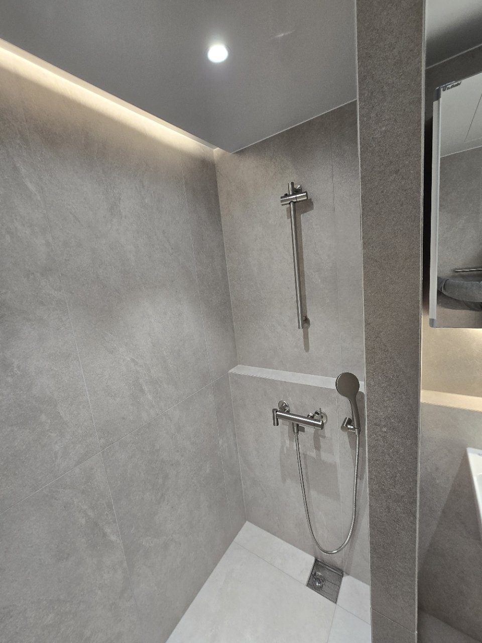 밝은 톤의 타일은 화사해 보이는 장점이 있지만, 물때나 얼룩이 눈에 잘 띄는 편입니다. 반면 적당한 톤의 그레이는 청소 후 깔끔함이 상대적으로 오래 유지되는 장점이 있어, 실사용이 많은 가정 욕실에 잘 어울립니다.