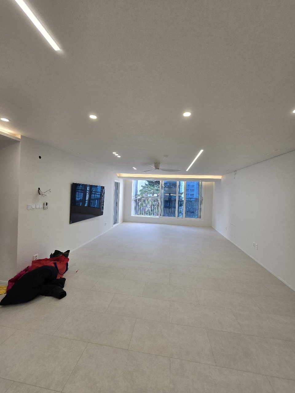 이번 우장산힐스테이트 거실은 바닥에 밝은 톤의 타일을 사용해 시야가 확장된 느낌을 줄 수 있도록 했습니다. 벽면은 화이트 톤으로 마감해 바닥과 자연스럽게 이어지도록 구성해 전체적으로 깨끗하고 정제된 인상을 주었습니다.