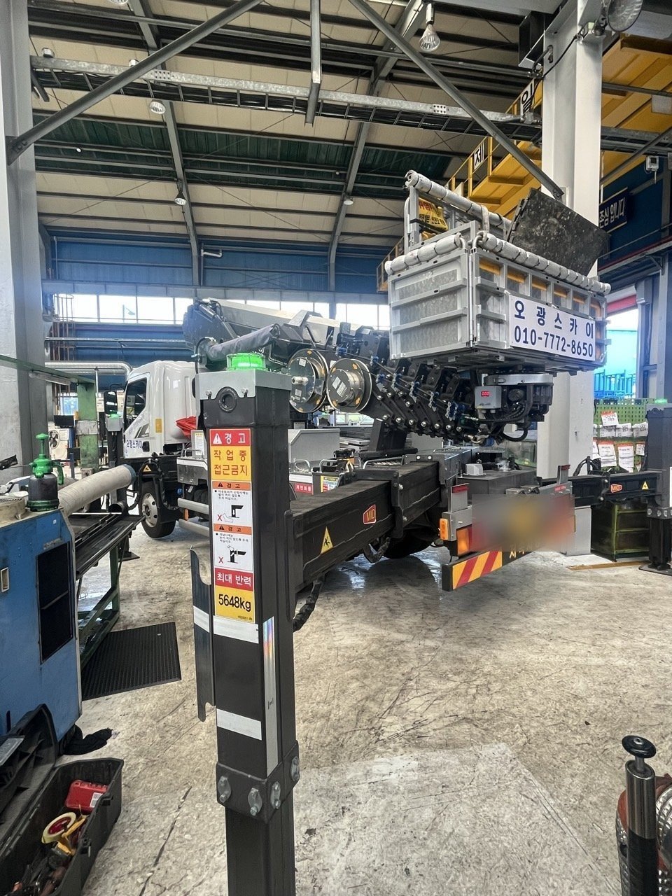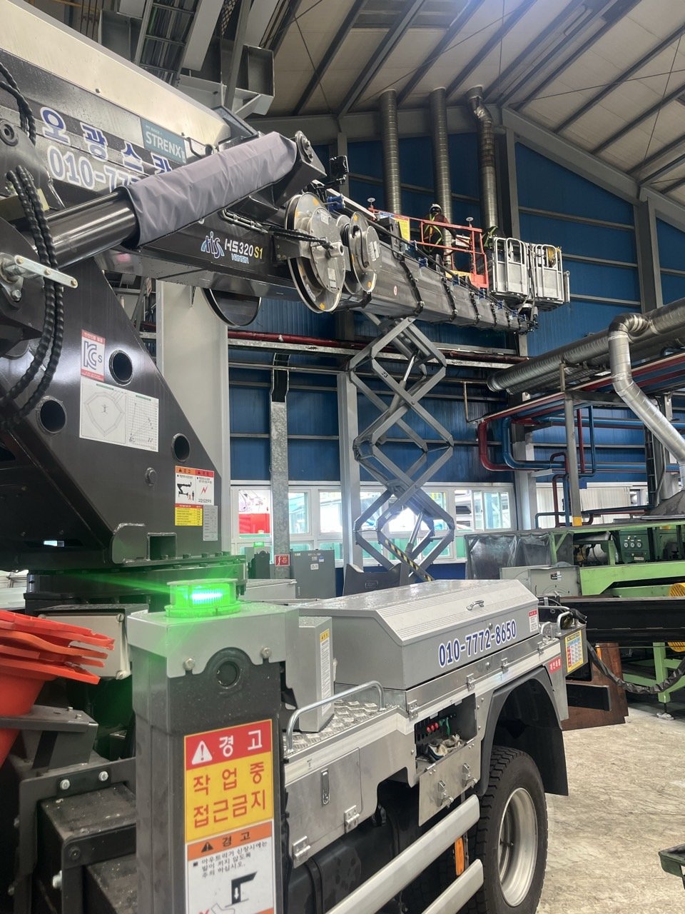 작업 장소는 넓지만 설비와 파이프 라인이 촘촘하게 배치된 실내였습니다. 이런 환경에서는 차량 위치 선정이 핵심이라, 기계와 기둥을 피해 지지대를 충분히 펼칠 수 있는 포인트를 먼저 탐색했습니다. 바닥 레벨과 동선까지 고려해 정밀하게 차량을 안착한 뒤, 고소에서 장시간 작업하실 작업자 분들이 안정적으로 철거에 집중할 수 있도록 탑승 높이와 각도를 세밀히 조정해 드렸습니다.