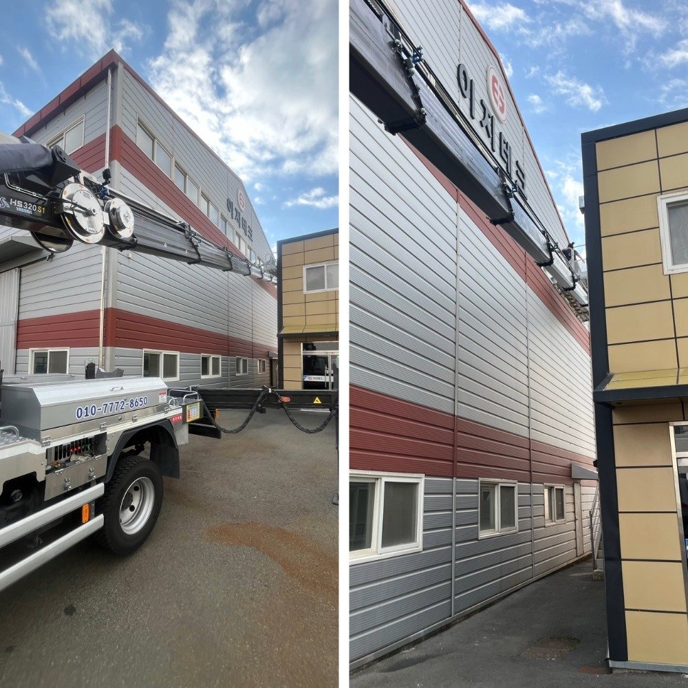 천막 구조물이 설치된 라인에서는 차량의 완전 진입이 어려워 붐 길이를 최대로 활용해 작업 범위를 확보했습니다. 이 과정은 장비 특성 이해와 경험이 큰 역할을 했고, 안전 여유거리와 각도 제한을 엄격히 지키면서도 작업 속도를 유지할 수 있었습니다. 덕분에 비계 설치 없이도 일정 내 마감이 가능했습니다.