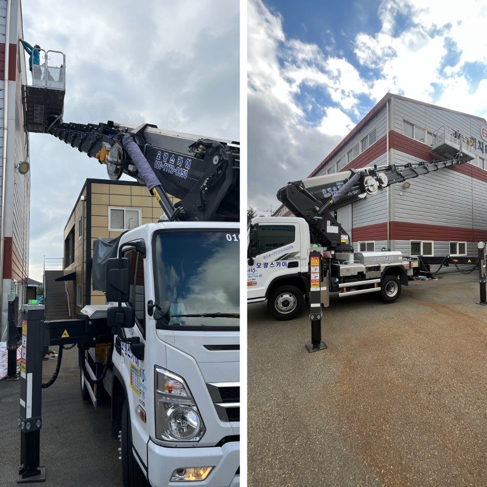 스카이차는 비계 설치 없이 고소작업을 빠르게 진행할 수 있어 시간과 비용을 줄일 수 있는 장점이 있습니다. 오광스카이는 1톤, 3.5톤, 5톤 스카이차를 보유하고 있으며, 작업 환경에 맞춰 최적 장비를 배치합니다.