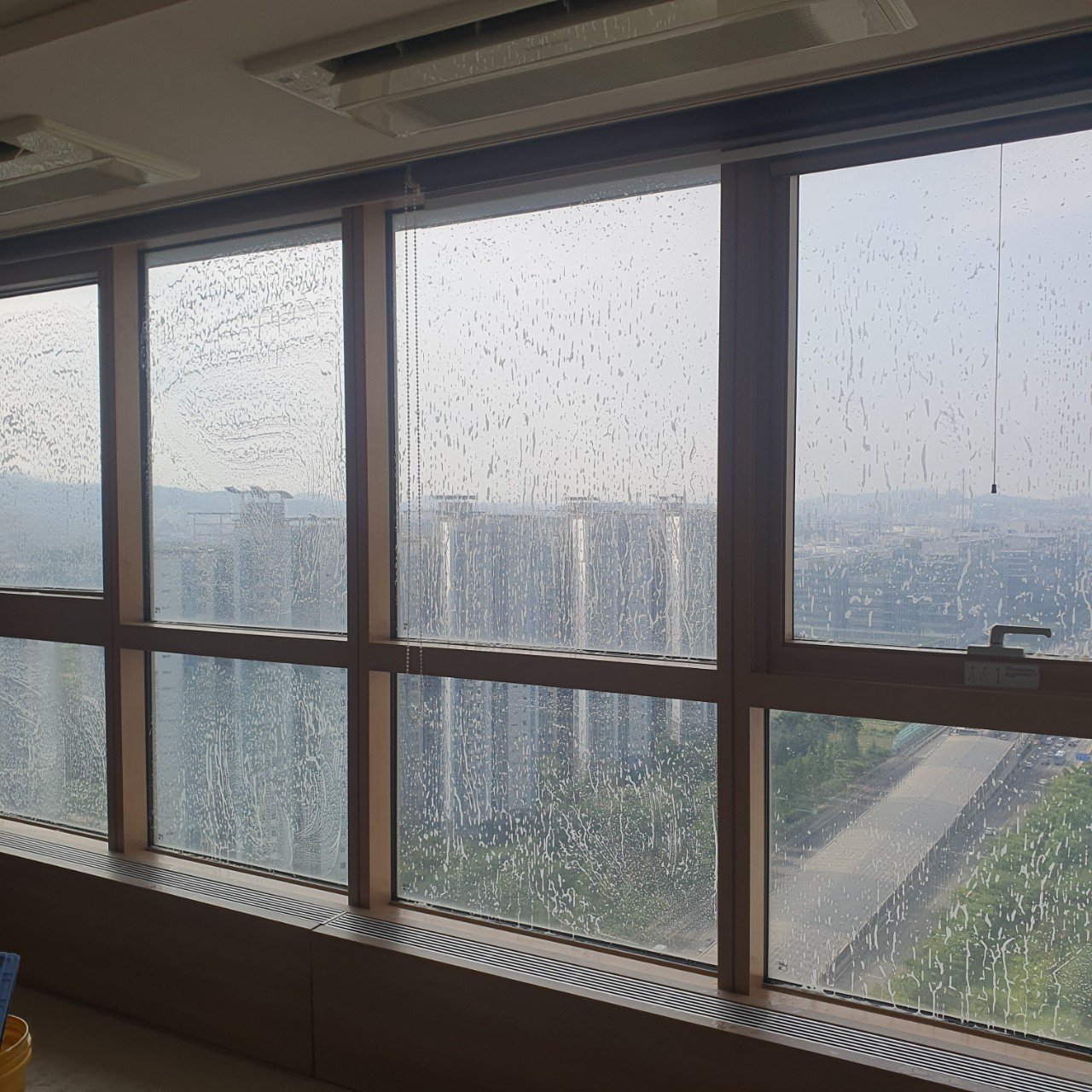 - 유리창과 창틀에 끈적한 오염막, 시야 흐림