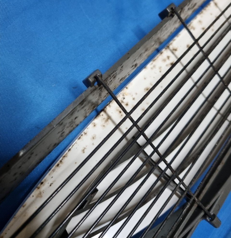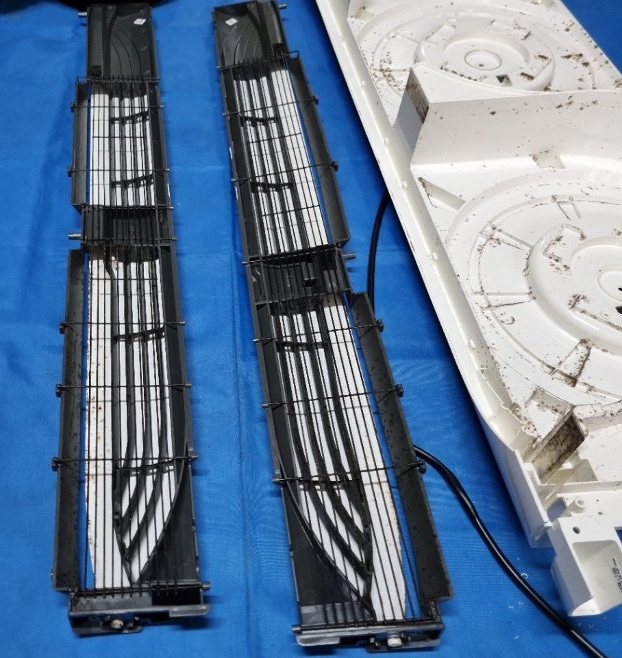 이번 현장 역시 외관은 멀쩡해 보였지만, 분해를 진행하며 하나씩 확인해보니 원형 커버 안쪽과 그릴 라인 주변에 검은 곰팡이 흔적이 군데군데 퍼져 있었고, 바람이 직접 통과하는 내부 부품에도 묵은 먼지가 층을 이룬 상태였습니다.