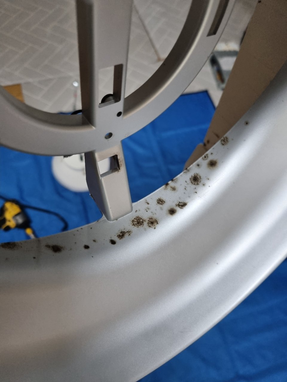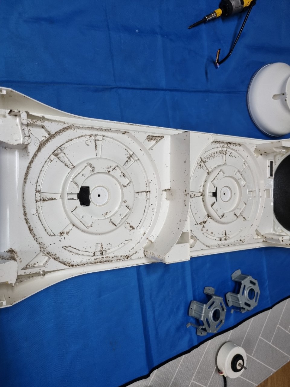 분해가 진행될수록 평소에는 보이지 않던 부분의 오염이 더 선명하게 드러났습니다. 특히 원형 커버 안쪽과 송풍팬 주변, 바람이 통과하는 덕트 부분에 먼지와 곰팡이가 함께 엉겨 있는 모습이 확인되었습니다.