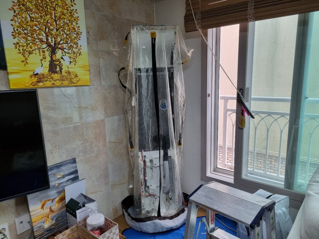 이번 의뢰는 제주시 도남에 거주하시는 고객님 댁에서 진행한 LG 손연재 타워형 에어컨 분해청소 현장이었습니다.