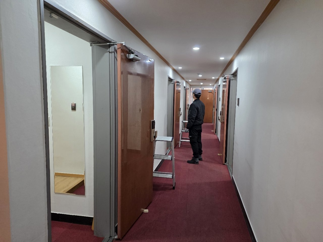 여러 대를 동시에 작업해야 하는 현장에서는 동선과 순서를 어떻게 잡느냐에 따라 전체 작업 효율과 완성도가 달라집니다. 이번에는 복도 동선을 기준으로 객실 순서를 정리한 뒤, 한 객실씩 마무리하는 방식으로 진행했습니다.