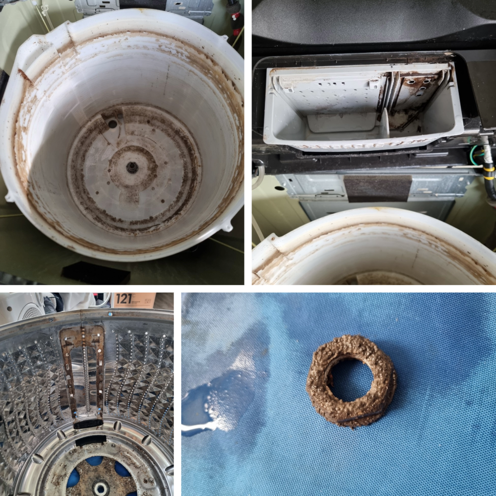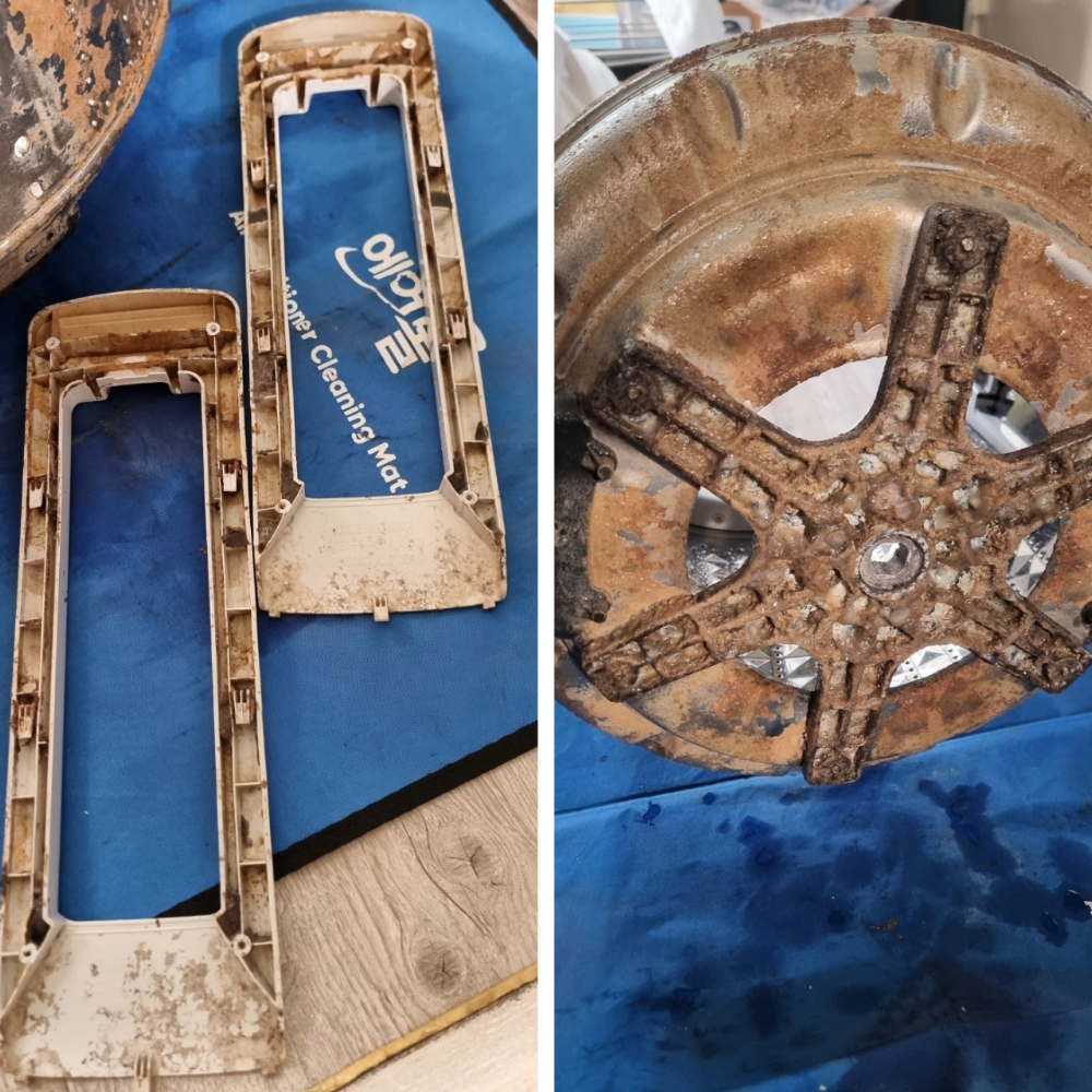 세탁조와 주요 부품을 하나씩 분리해 보니 예상대로 오염이 꽤 누적된 상태였습니다. 세탁조 외부와 바닥면, 그리고 부품 틈새를 따라 굳어 있는 찌든 때가 눈에 띄었고, 일부 구간은 세제 찌꺼기와 물때가 단단하게 굳어 일반적인 닦기만으로는 제거가 어려운 상태였습니다.