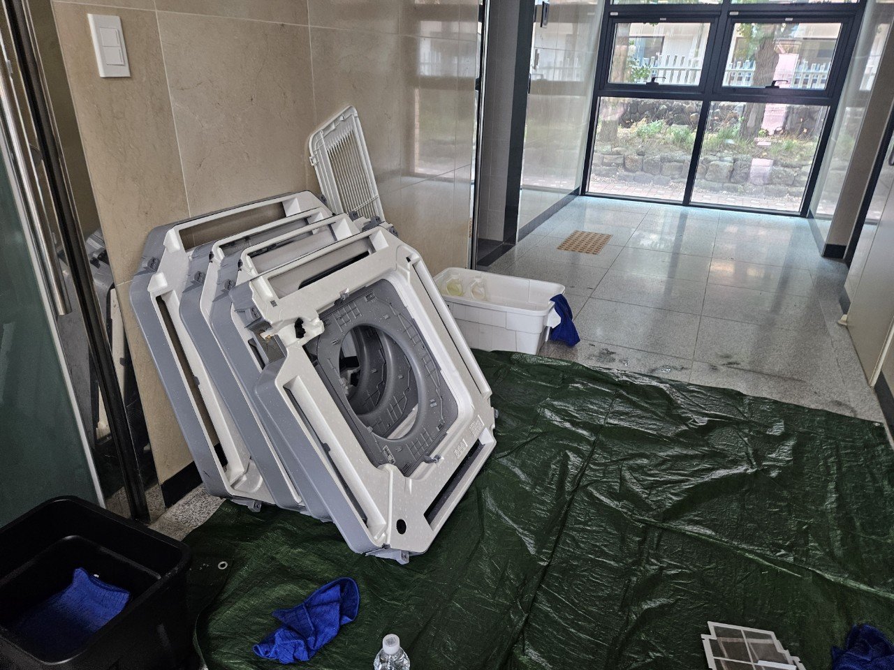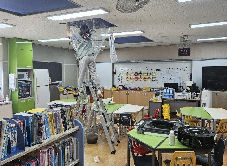 점검 후에는 바닥과 책상, 비품들이 세척수나 오염물에 노출되지 않도록 보양 작업을 진행합니다. 학교 공간은 특히 책과 교구들이 많기 때문에, 비닐 커버링과 천막, 커버 등을 이용해 최대한 안전하게 보호한 뒤 본격적인 분해에 들어갑니다.