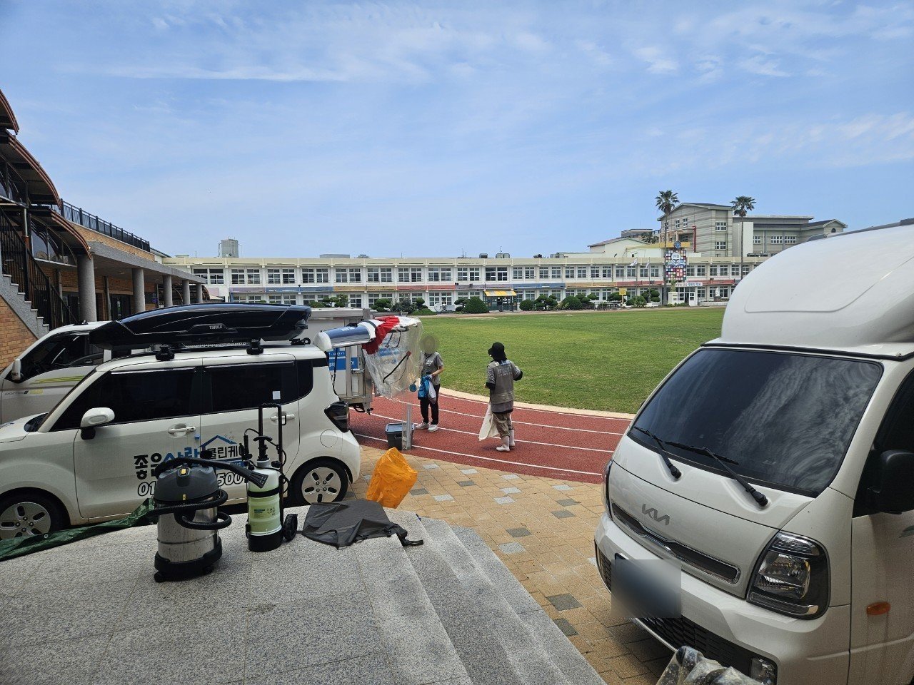 총 작업 대수는 125대로, 교실과 복도, 급식실 등 학생들이 오랜 시간을 보내는 공간 곳곳에 설치된 기기들이었습니다. 아이들이 생활하는 장소인 만큼 평소보다 세척과 헹굼 과정을 더 꼼꼼하게 가져가는 방향으로 계획을 세웠습니다.
