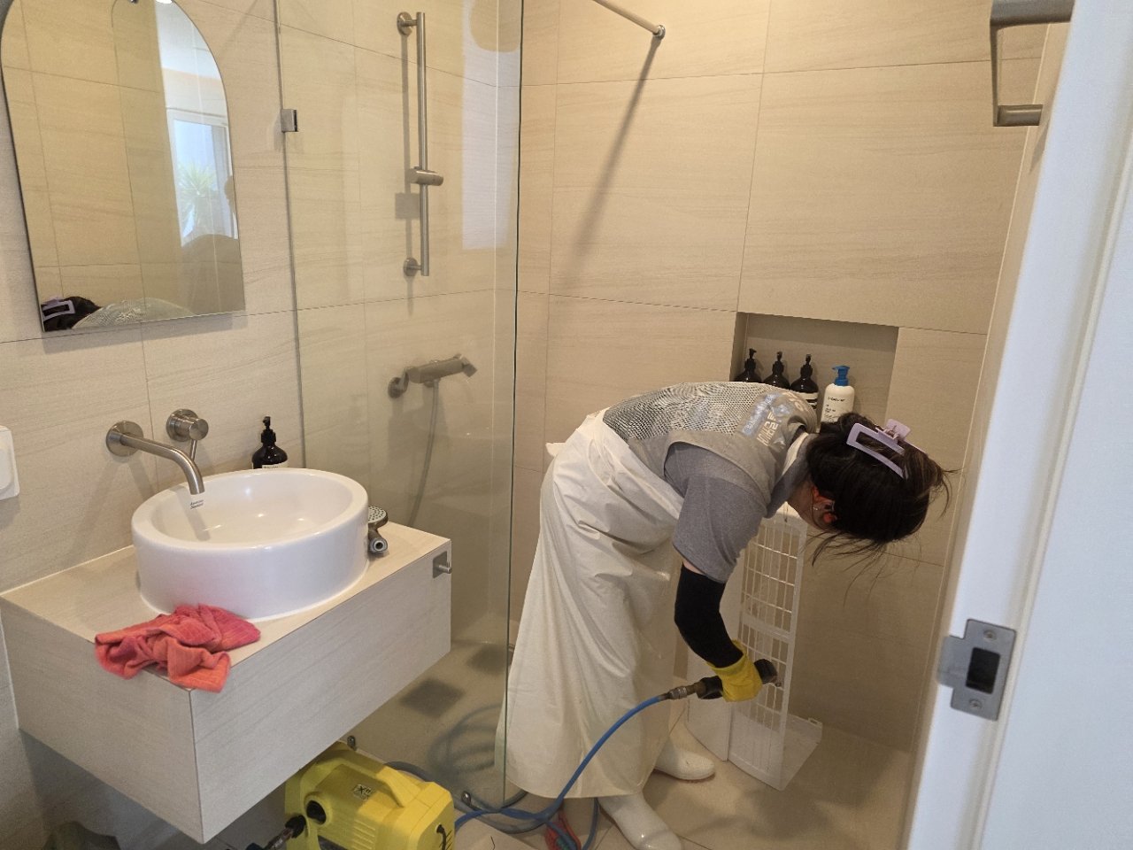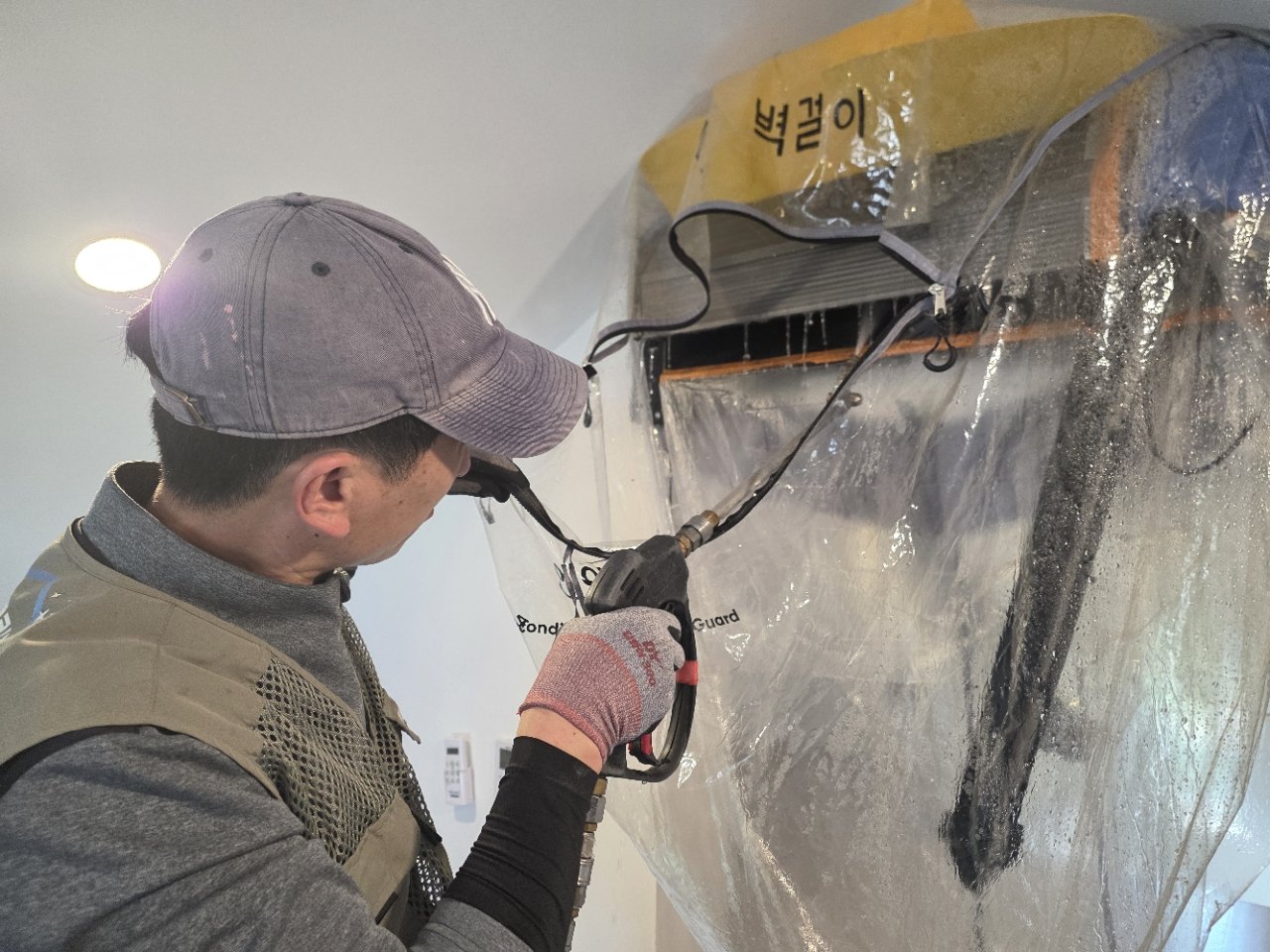 현장에서는 먼저 주변 가구와 바닥을 꼼꼼하게 보양해 세척 과정에서 오염수 비산이 없도록 준비합니다. 이후 장비를 설치하고 분해 가능한 부품을 하나씩 안전하게 탈거하면서 본격적인 작업을 시작합니다.
