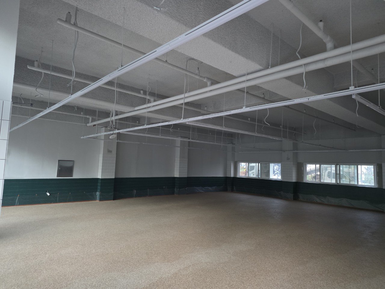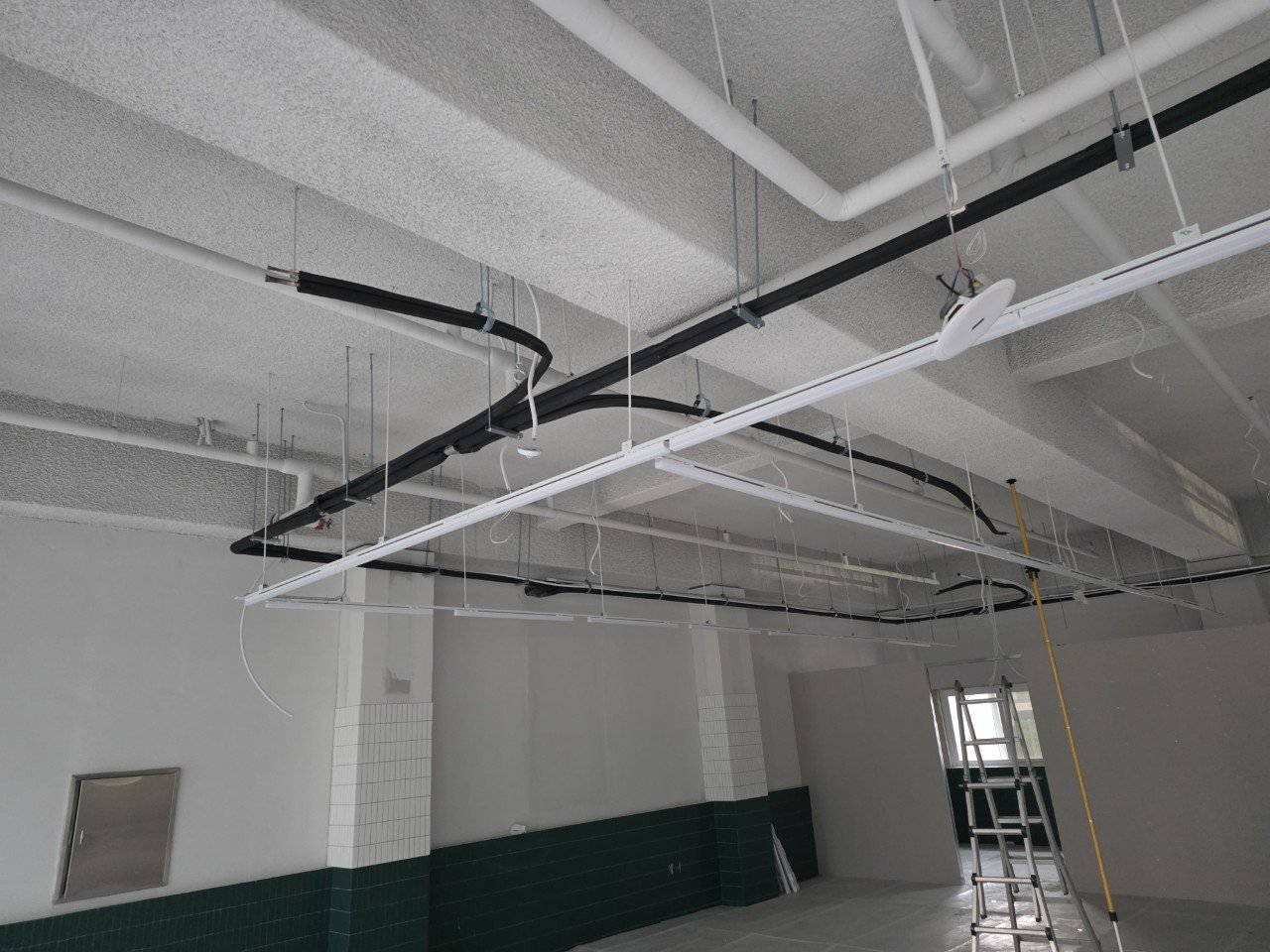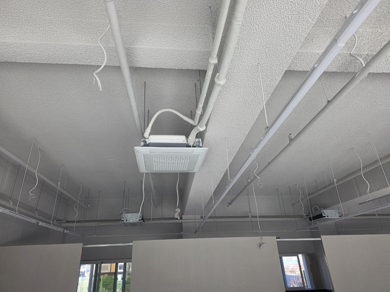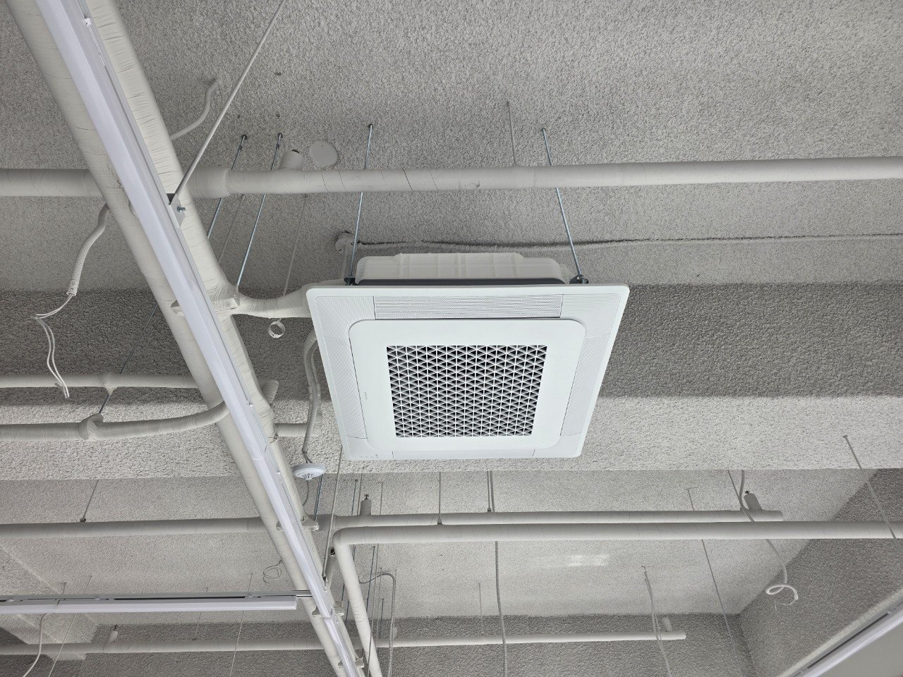 이후 천장에는 천장형 시스템 에어컨 실내기를 일정 간격으로 배치했습니다. 노출 천장 구조 특성상 실내기의 높이, 수평 상태, 배관 마감이 어떤 방향에서 보더라도 정돈되어 보이도록 한 번 더 점검했습니다.