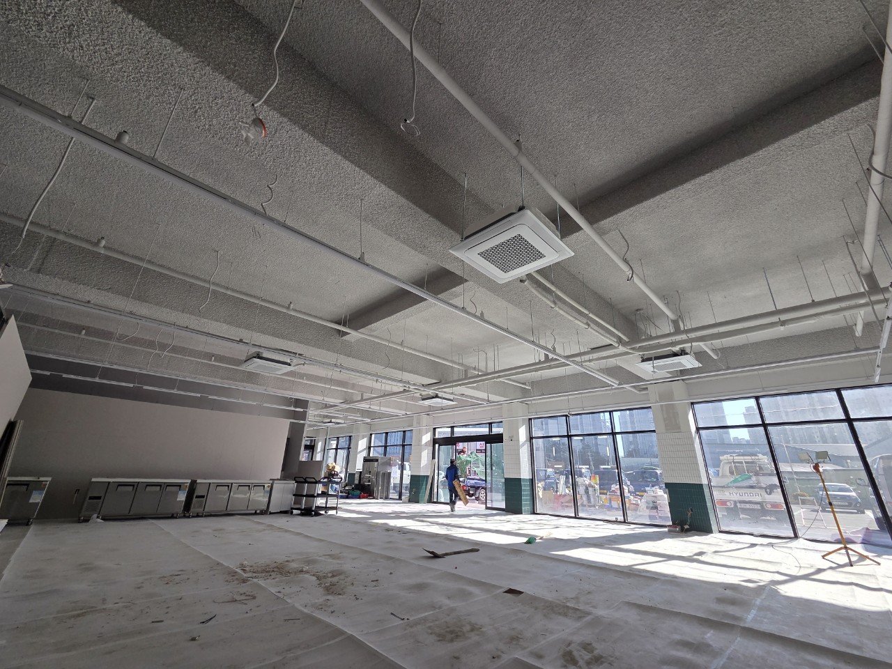 배관을 가능한 한 정직한 라인으로 정리하고, 실내기의 위치도 인테리어 계획과 동선을 고려해 설치해 향후 상가에 어떤 업종이 입점하더라도 어색하지 않도록 구성했습니다.